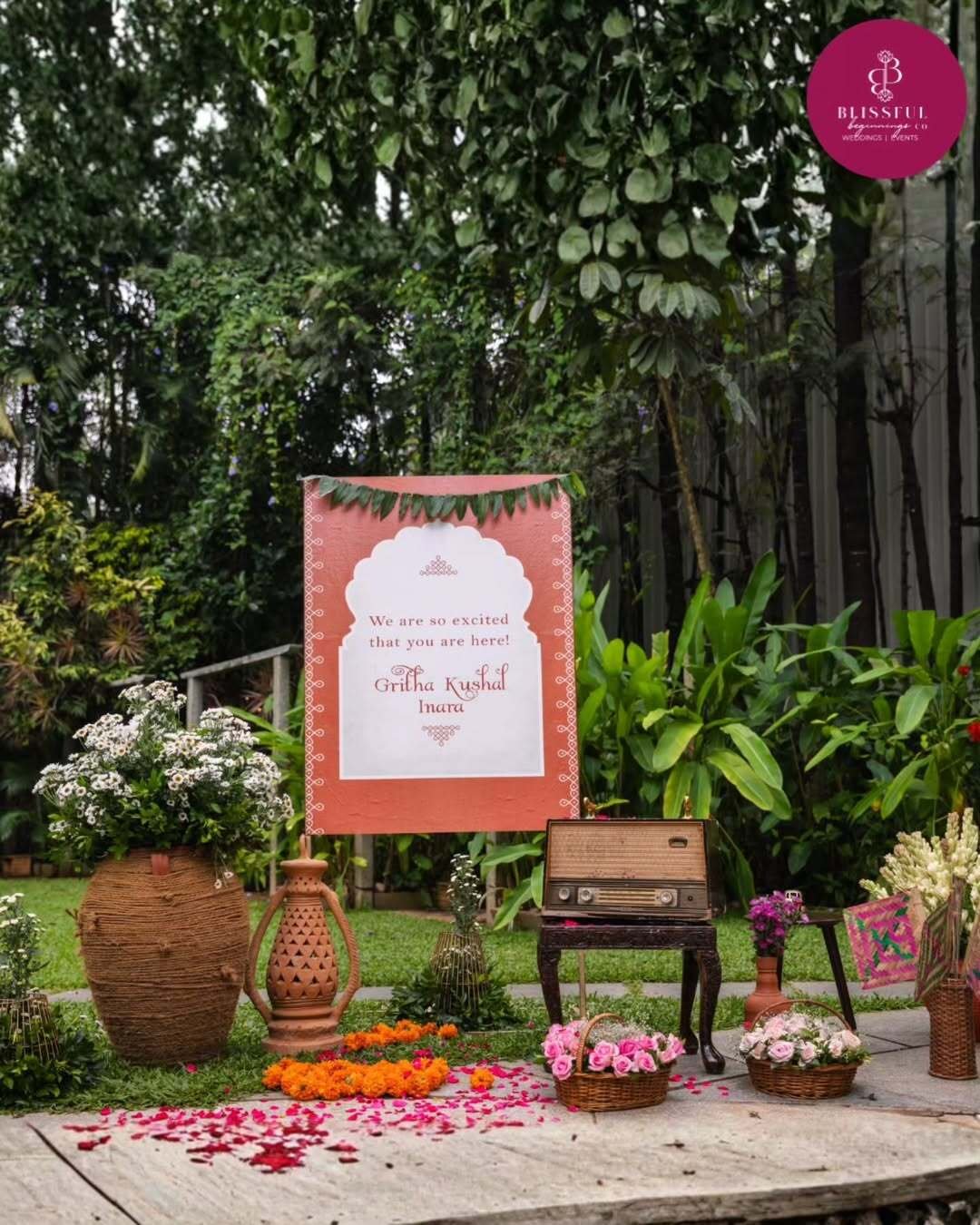 A completely different take—and one that feels joyfully rooted in tradition—@blissfulbeginningsco brings vibrant charm to this lush garden entry. The terracotta sign is softened with a white scalloped print insert and framed by florals, woven urns, and a vintage radio.