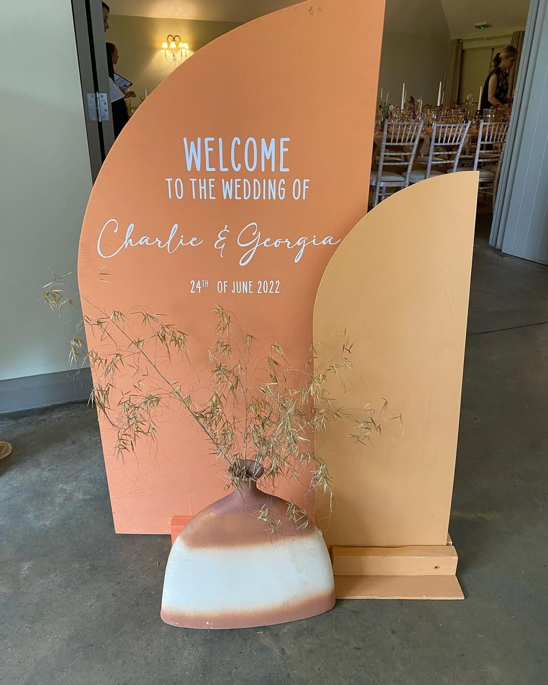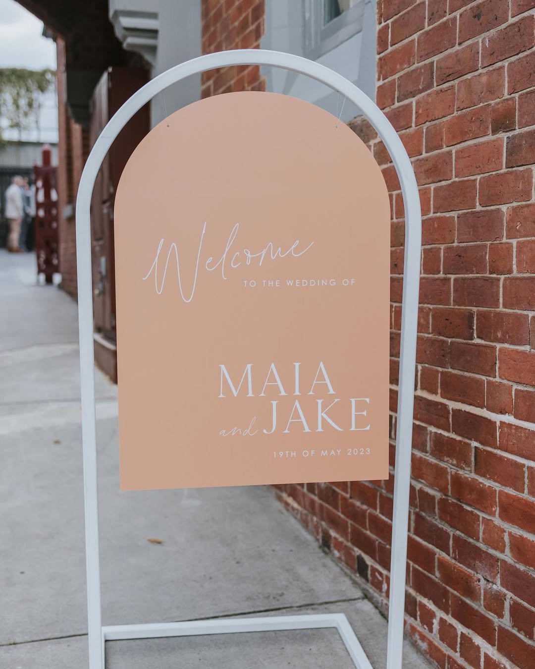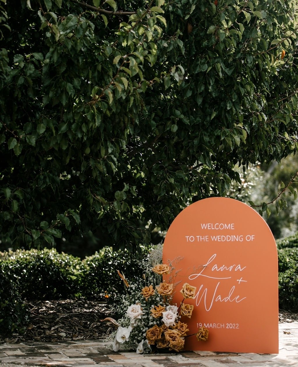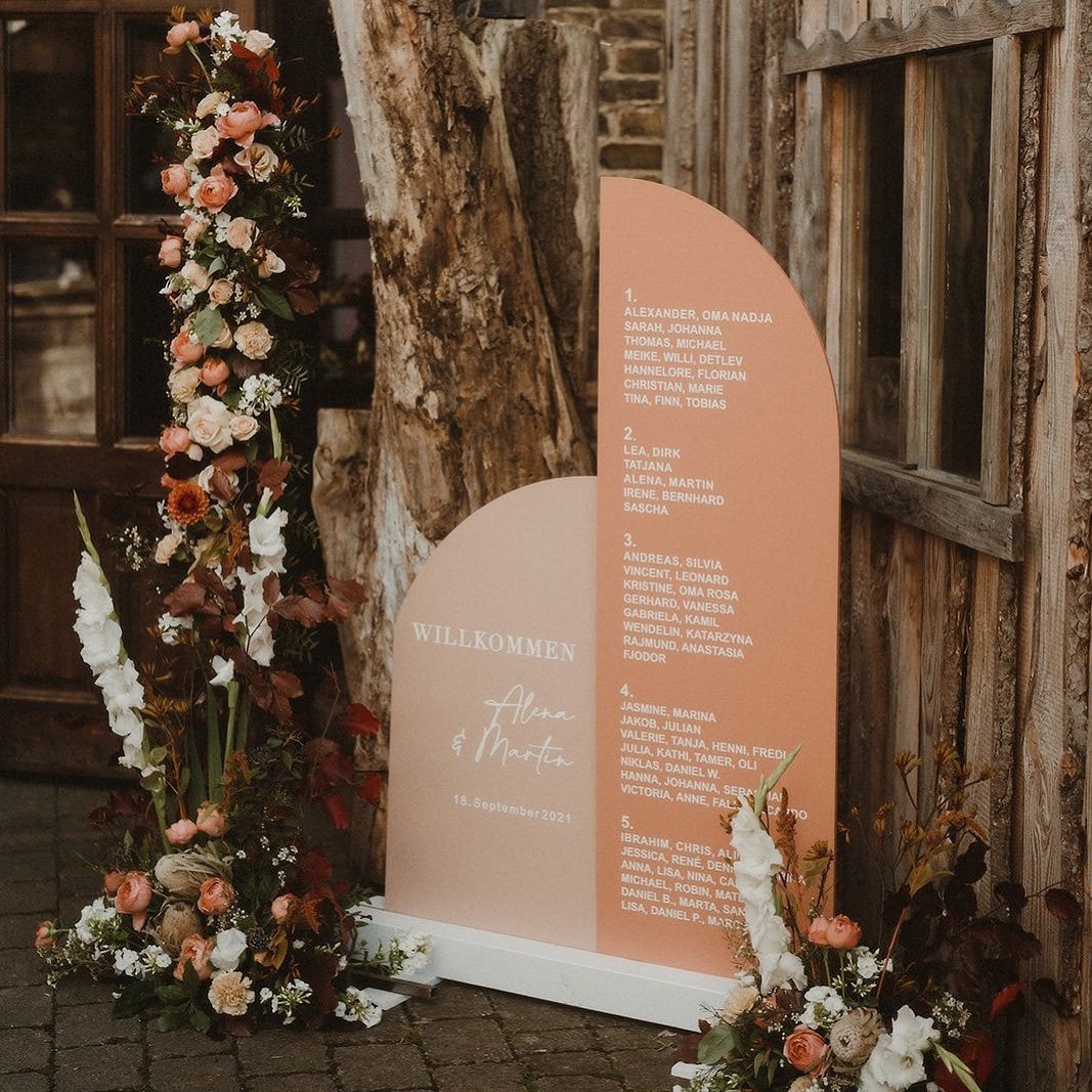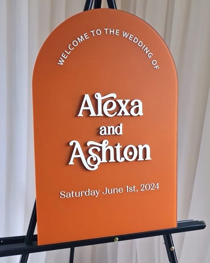 This arched sign by @everlongevents_ is tucked into manicured greenery, and it’s so quietly stunning. The orangey-coral tone feels rich without being loud, while the handwritten script adds softness and intimacy.