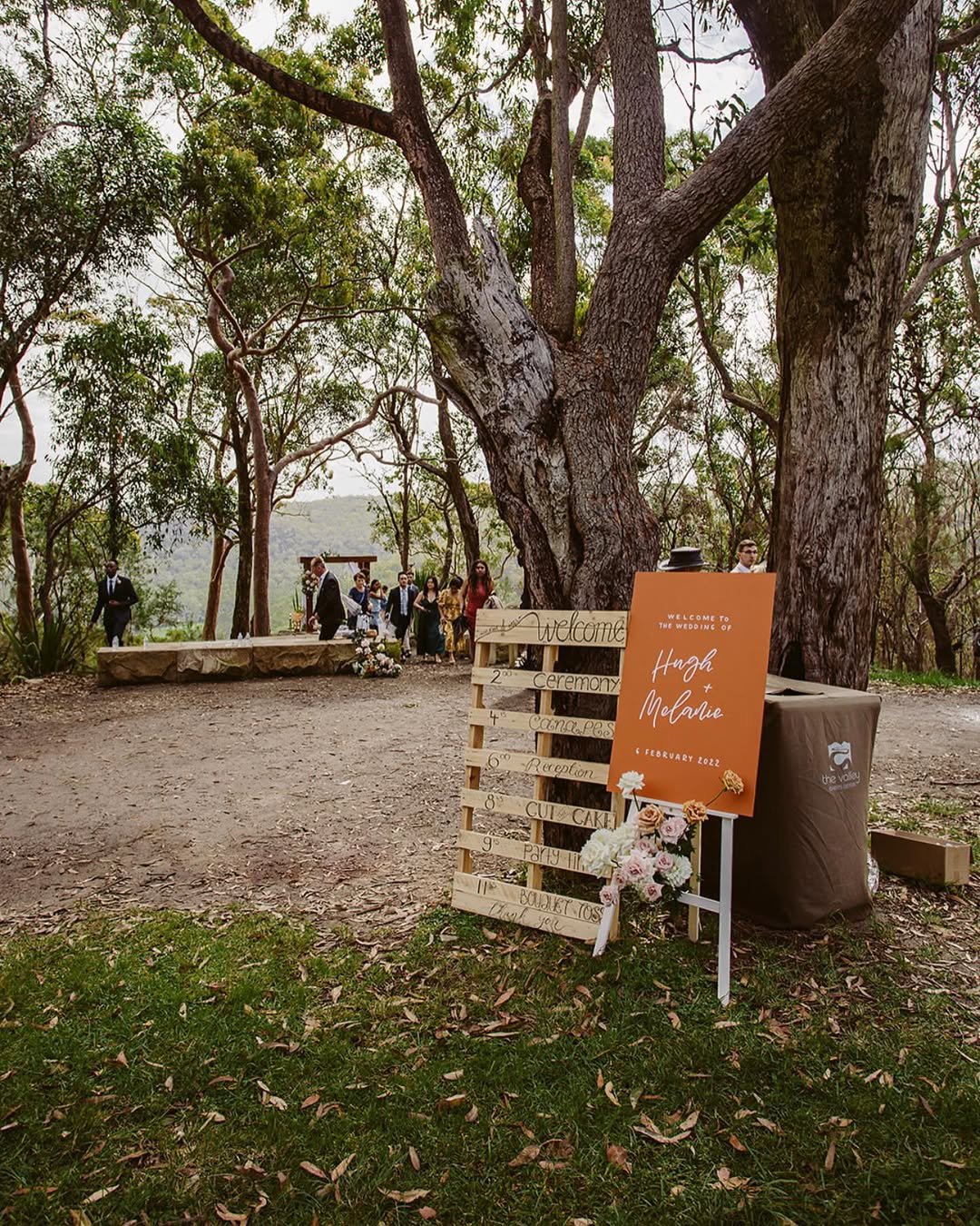 Tucked beneath tall trees and framed by rustic wood slats, this terracotta signage by @bbcollective_ feels like it was made for a woodland ceremony. The vibrant burnt sienna hue pops against the greens and browns of nature, while the white calligraphy-style names add a personal, poetic touch.