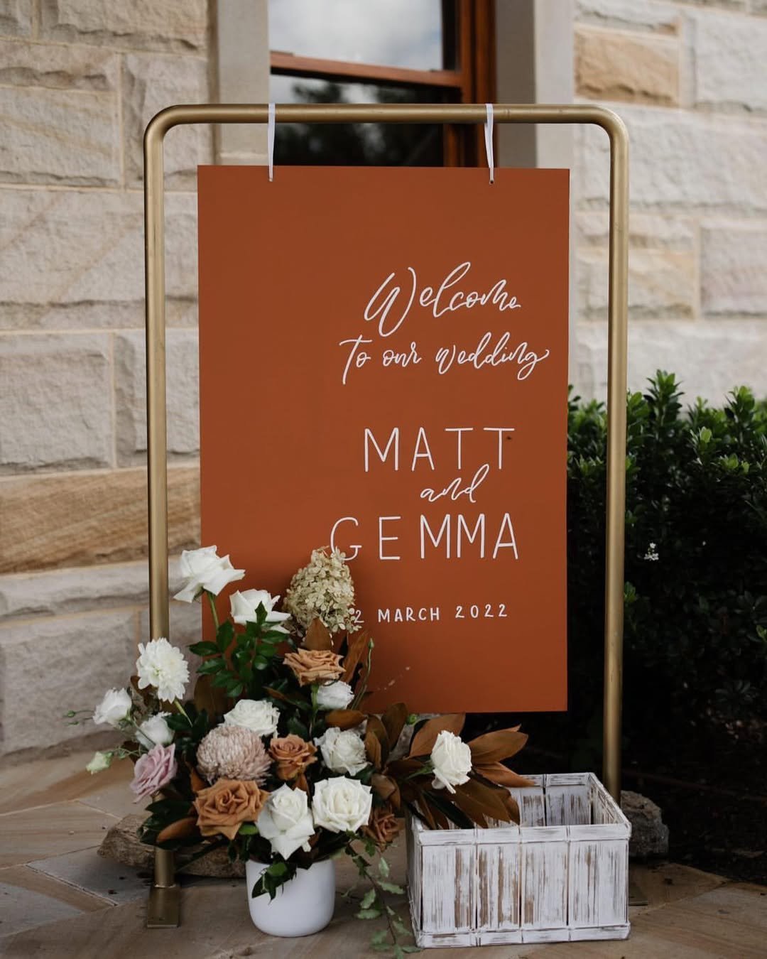 This welcome sign by @bbcollective_ leans into a deeper rust tone—warm, bold, and timeless. Hung from a matte brass frame and paired with organic florals in creamy whites and muted caramels, it creates a gorgeous first impression.