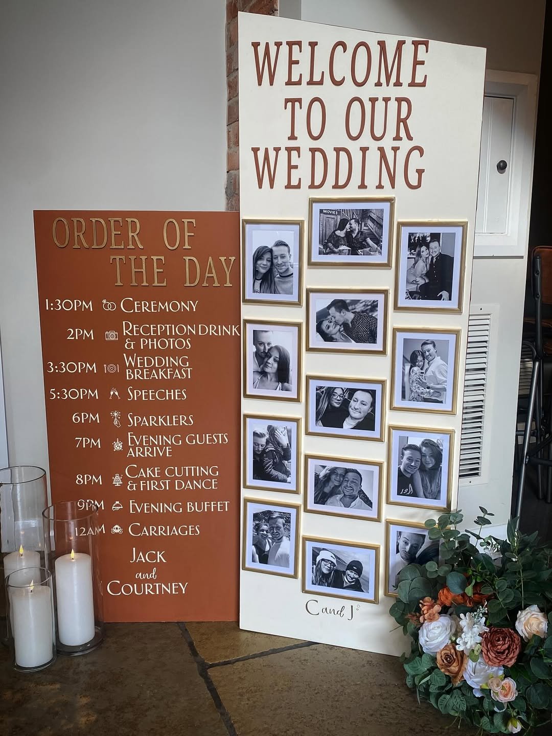 This setup hits that sweet spot between personal and polished. The photo collage brings a lived-in intimacy, while the burnt sienna sign balances it with grounded warmth. It tells a story: not just of timelines and toasts, but of the couple’s shared history.