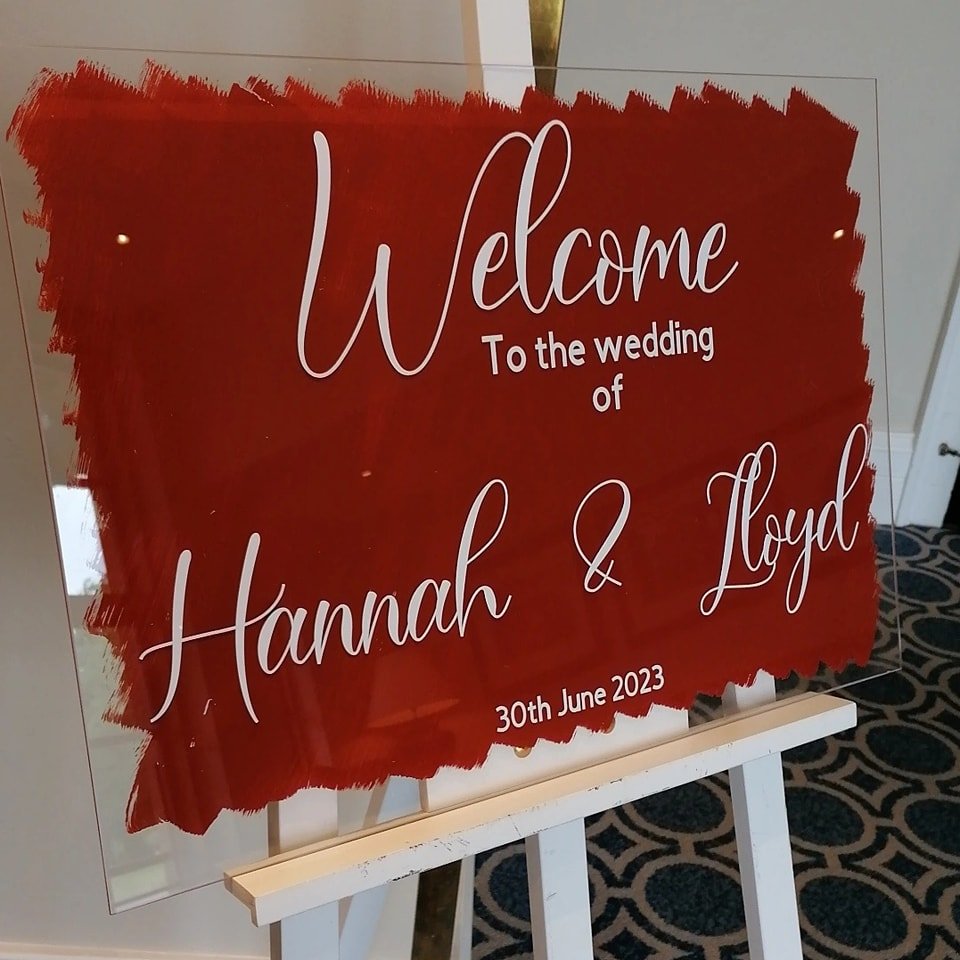 A clear acrylic sign gets a bold brushstroke of deep crimson—dramatic, romantic, and just a little bit daring. The freeform paint edge feels like a love note scrawled in lipstick, while the flowing white script softens it with a touch of charm.