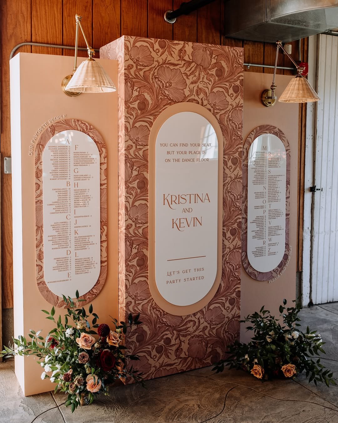 This is maximalism done right. From the warm floral wallpapering to the layered arches and luxe lighting, the sign installation for Kristina and Kevin feels like a bespoke boutique meets romantic theatre set. Every detail is lush, layered, and deeply tactile.