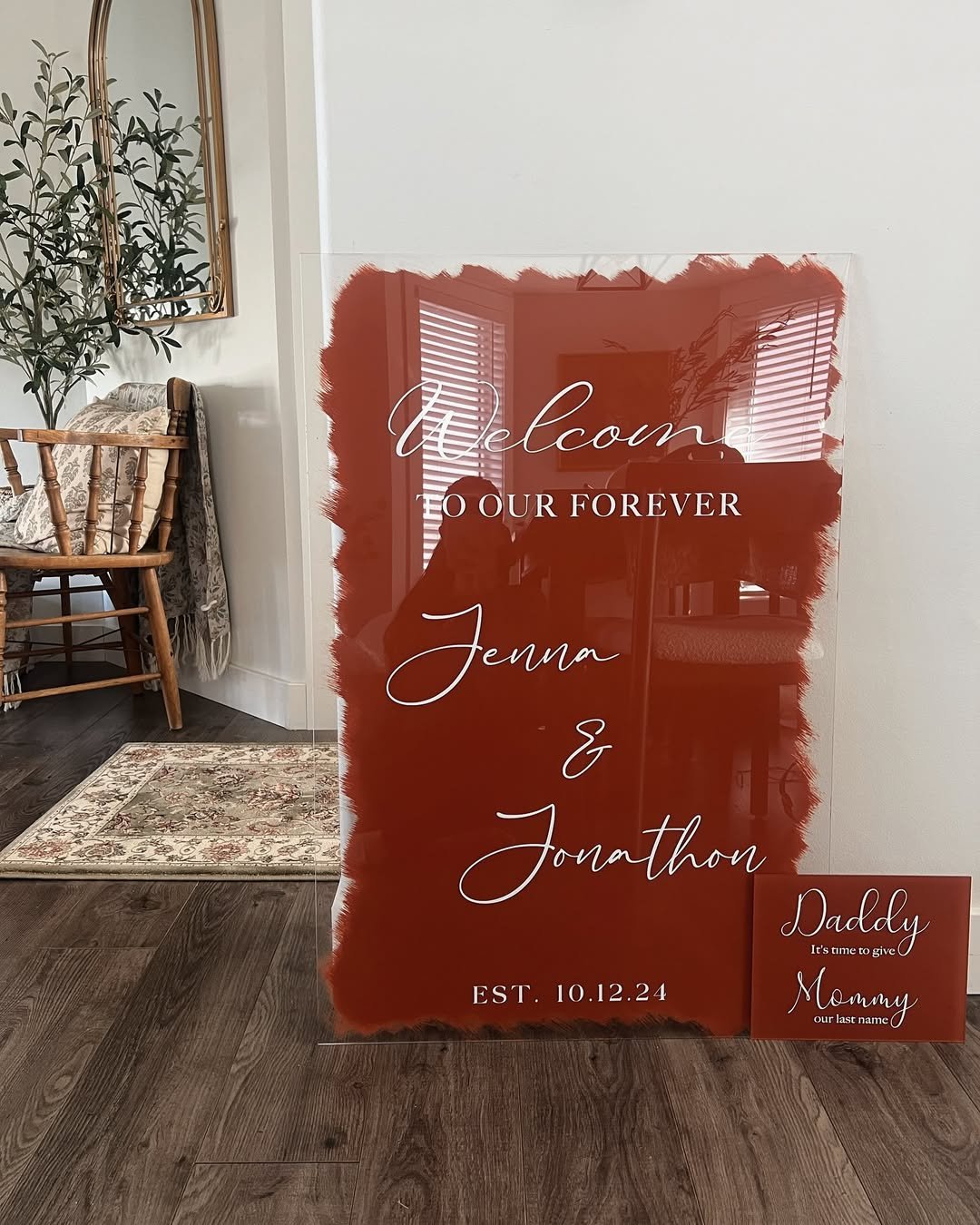 This bold and brush-stroked sign has a raw, romantic energy that feels both intimate and modern. The rich terracotta color creates instant warmth, grounding the dreamy white calligraphy with a confident contrast. Set inside a cozy living space with vintage touches—like a wooden spindle chair and ornate mirror—the whole vibe whispers heritage but with a fresh perspective.
