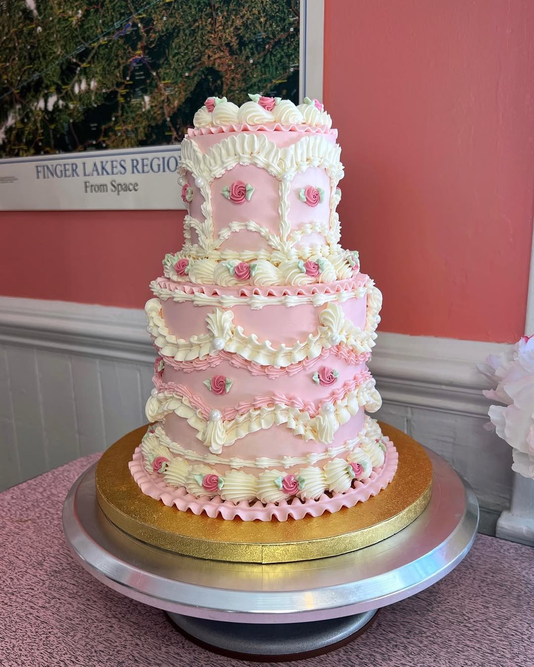 This cake is giving full-on vintage Barbie glam, and we’re here for every ruffle. With piped pearls, candy-pink frosting, and dainty rosebuds tucked into scalloped borders, it looks like something Marie Antoinette might’ve ordered if she shopped at a pastel diner in Palm Springs.