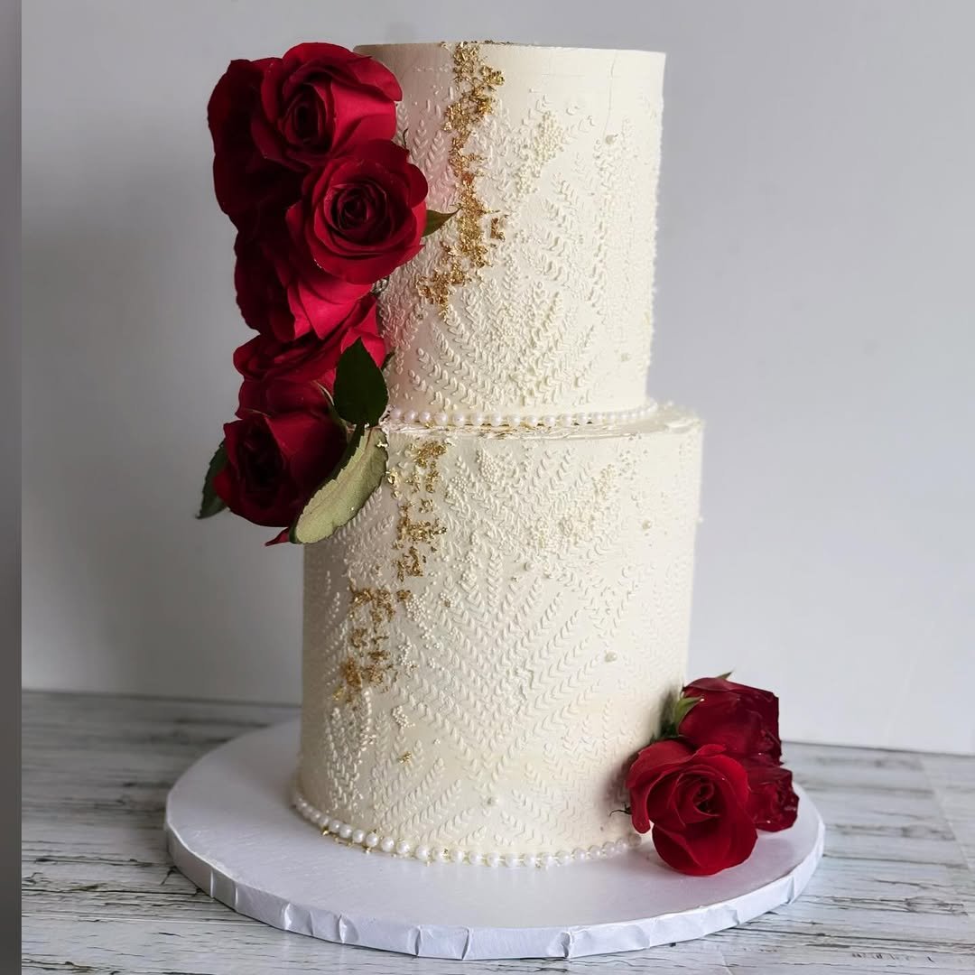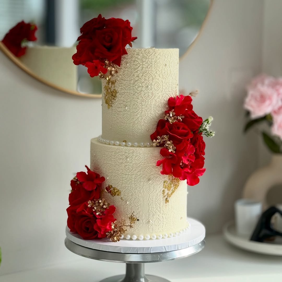 Red roses on cream—need I say more? This tiered beauty is a sultry little showstopper, laced with golden flake trails and piped textures that feel like vintage lace. It’s bold, a little theatrical, and totally unapologetic.
