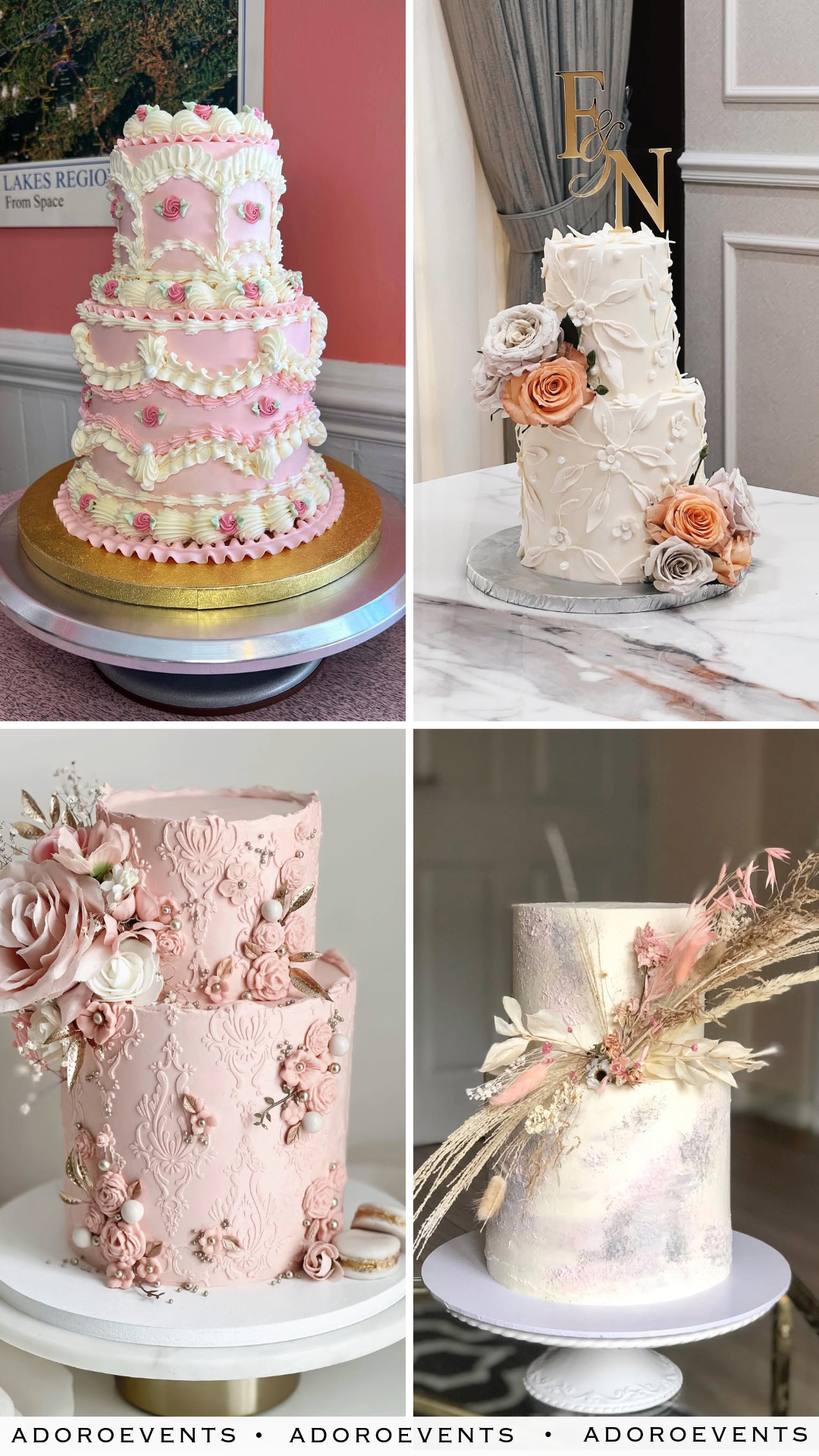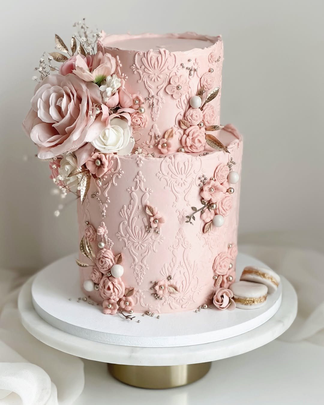 This blush pink masterpiece is straight out of a Parisian pastry dream. Think ornate embossed piping, sugar pearls, and floral flourishes that practically beg for a champagne toast. It’s girly, yes, but also exquisitely detailed—like a couture gown in cake form.