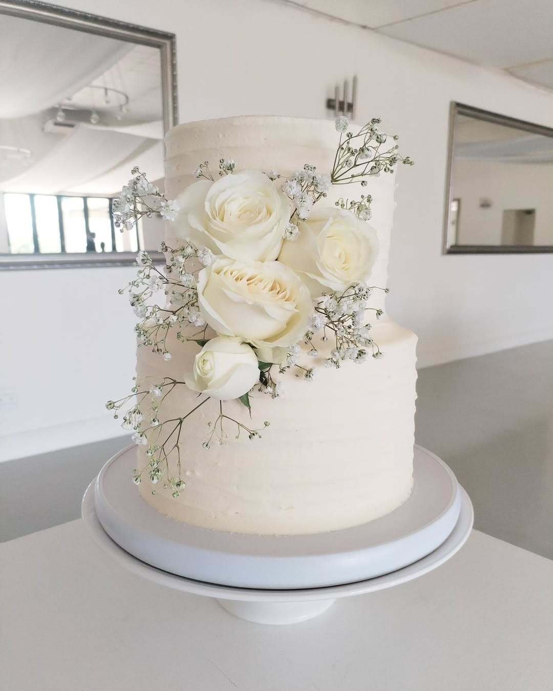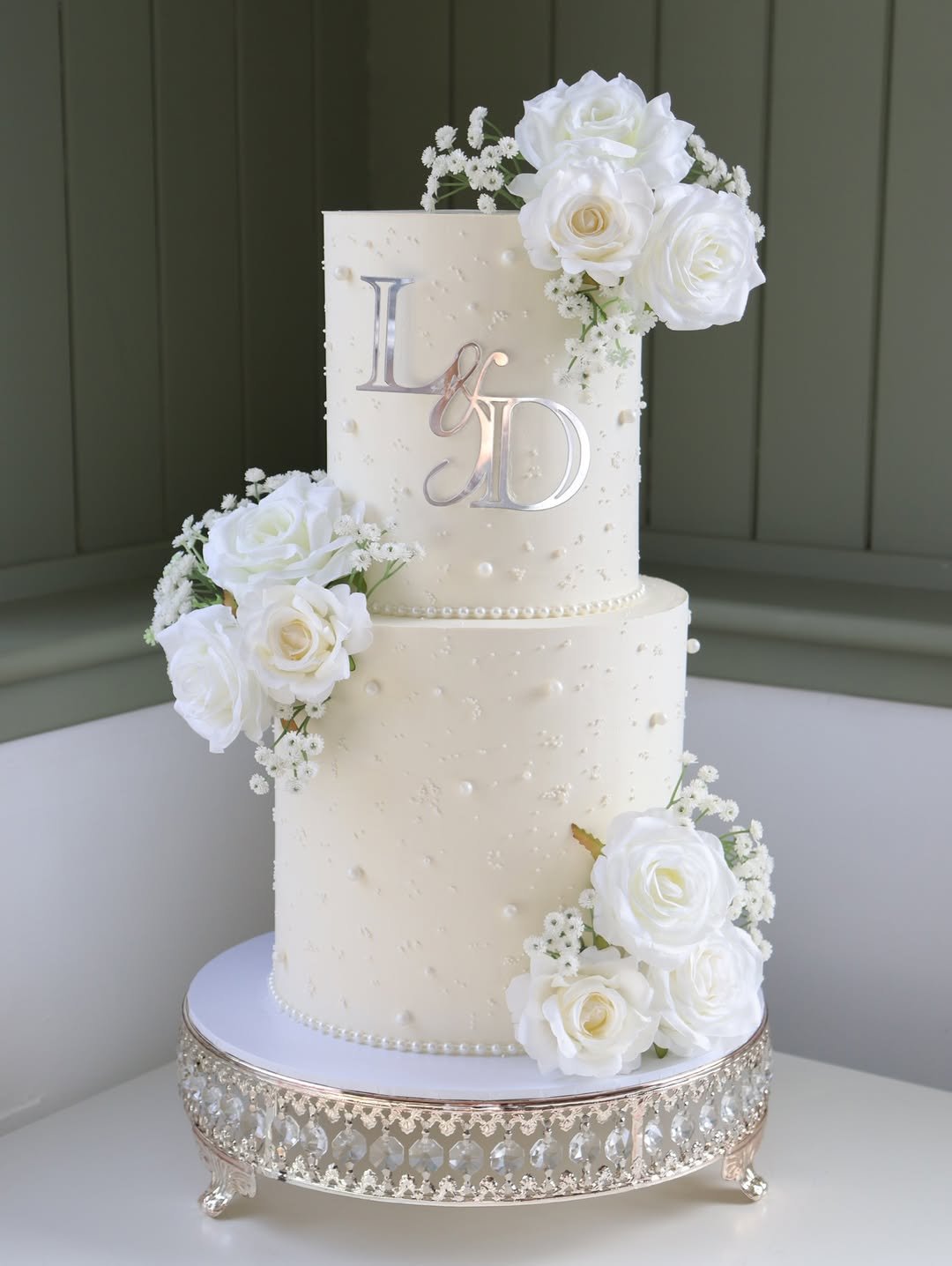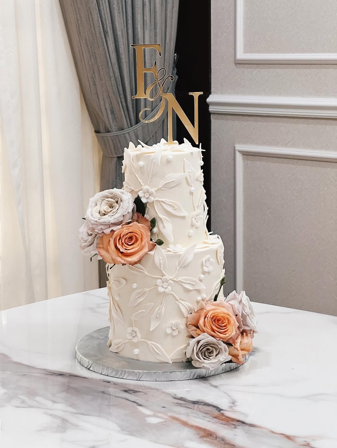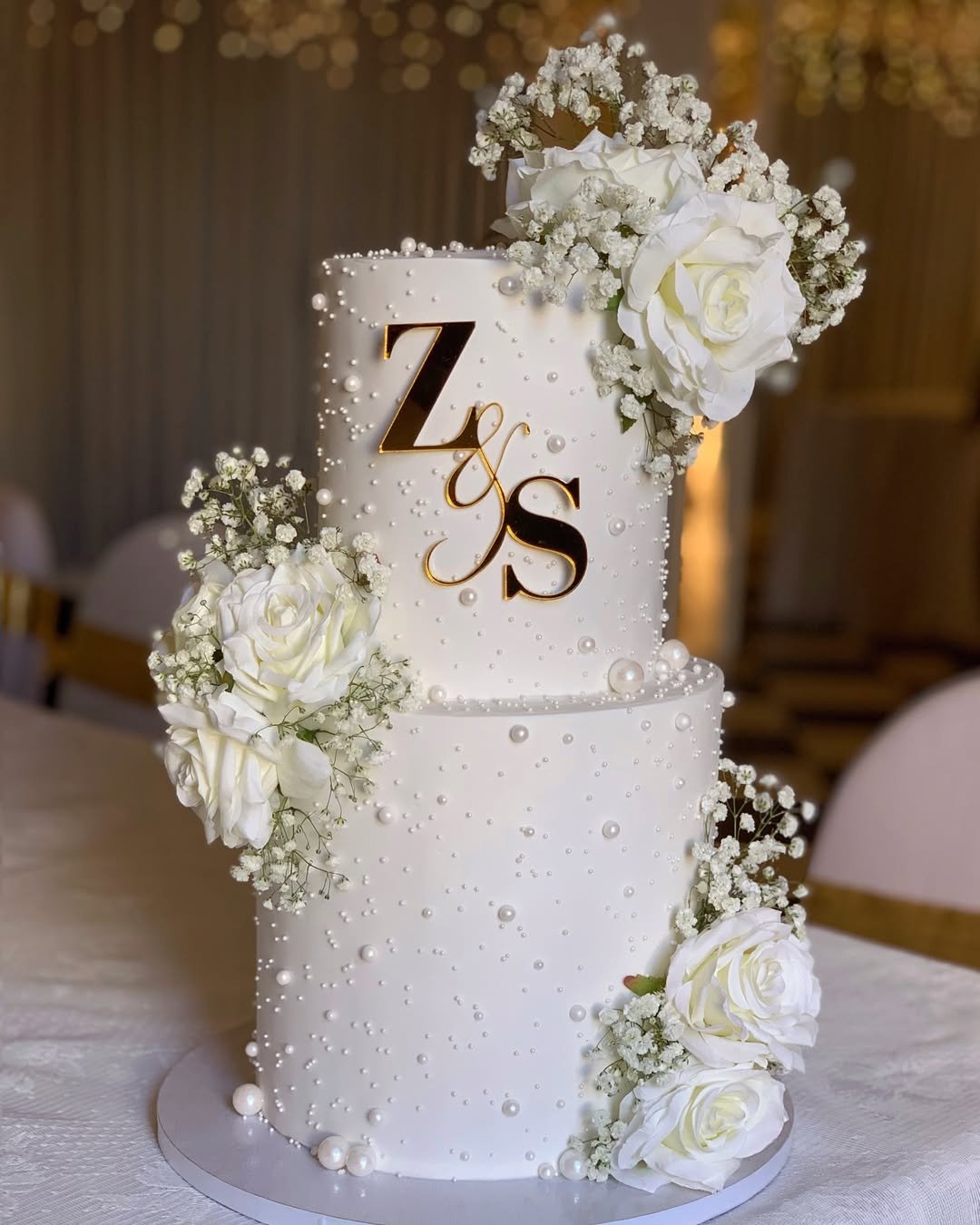 If Audrey Hepburn were a wedding cake, this would be her. Adorned in pearl-like sugar beads and crowned with lush white roses and baby’s breath, it’s a classic dream—timeless, polished, and quietly luxe. The gold “Z & S” monogram adds just the right flash of drama, like a bold earring with an ivory silk gown.