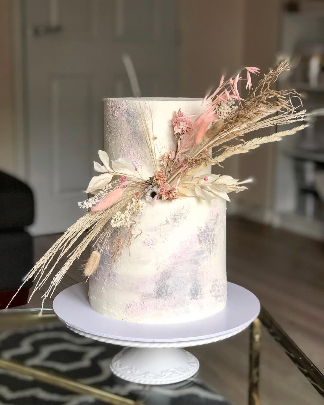 This cake feels like a whisper from a dried flower bouquet—soft, romantic, and just a little wild. The marbled buttercream base has painterly washes of blush and lavender, giving it an organic, hand-touched finish. Then there’s the cascade of bleached florals, bunny tails, and dusty pinks that feel plucked from a sun-faded still life.
