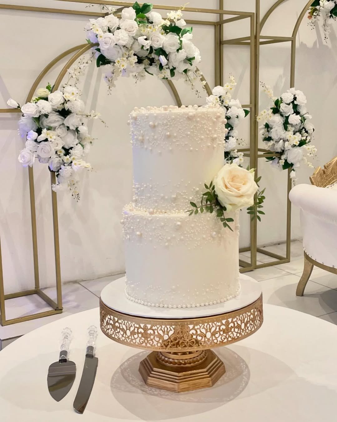 This is the kind of cake that doesn’t follow trends—it sets them. Clean lines, artful florals, and just enough glimmer to catch the light. Effortlessly elegant.