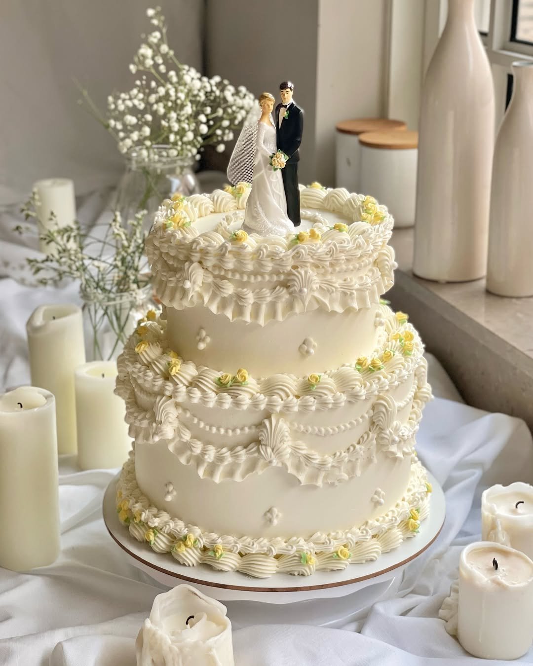 There’s something so timeless about a buttercream cake crowned with a classic wedding topper. This one feels like a romantic nod to the ’50s, but still fresh thanks to delicate yellow blooms and lush piping that ripples like the hem of a vintage veil.