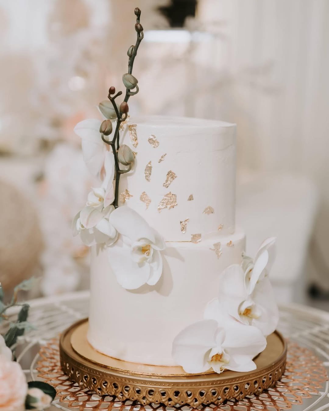 If you believe less is more, this cake might be your soulmate. Sleek, white buttercream with delicate gold leafing and cascading orchids feels like a gallery-worthy moment. It’s soft and modern, but still rooted in tradition.