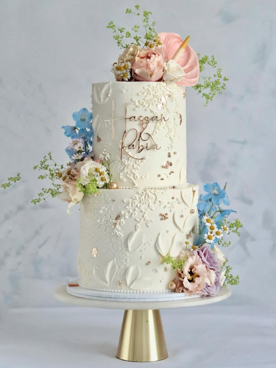 A floral fantasy that leans maximal in the best way. Embossed buttercream, fondant petals, and a flurry of real blooms come together like a secret garden bursting into full bloom. The soft blues, dusty purples, and golden detailing make it feel both whimsical and refined.