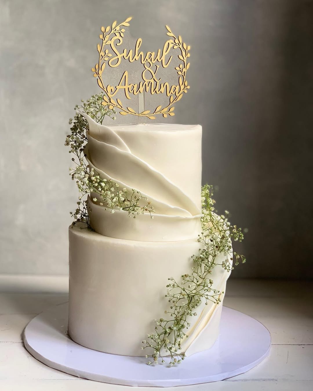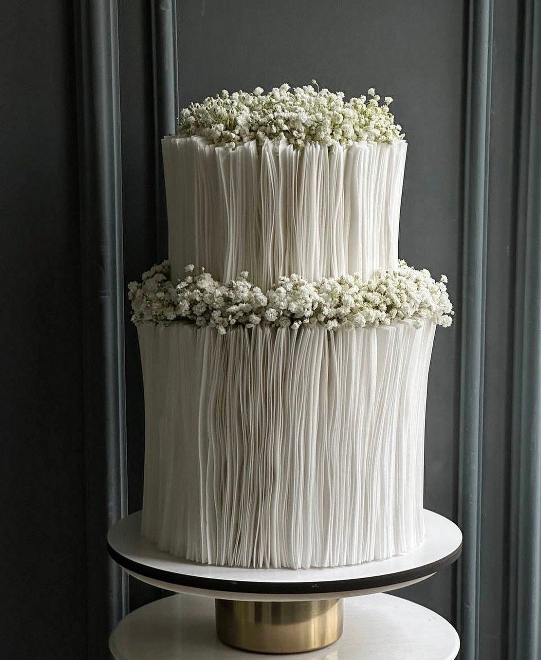 Now this is drama done differently. Long, pleated fondant strips create a soft, curtain-like texture that’s almost architectural. Topped and ringed with baby’s breath, the result is unexpectedly serene and fashion editorial-worthy.