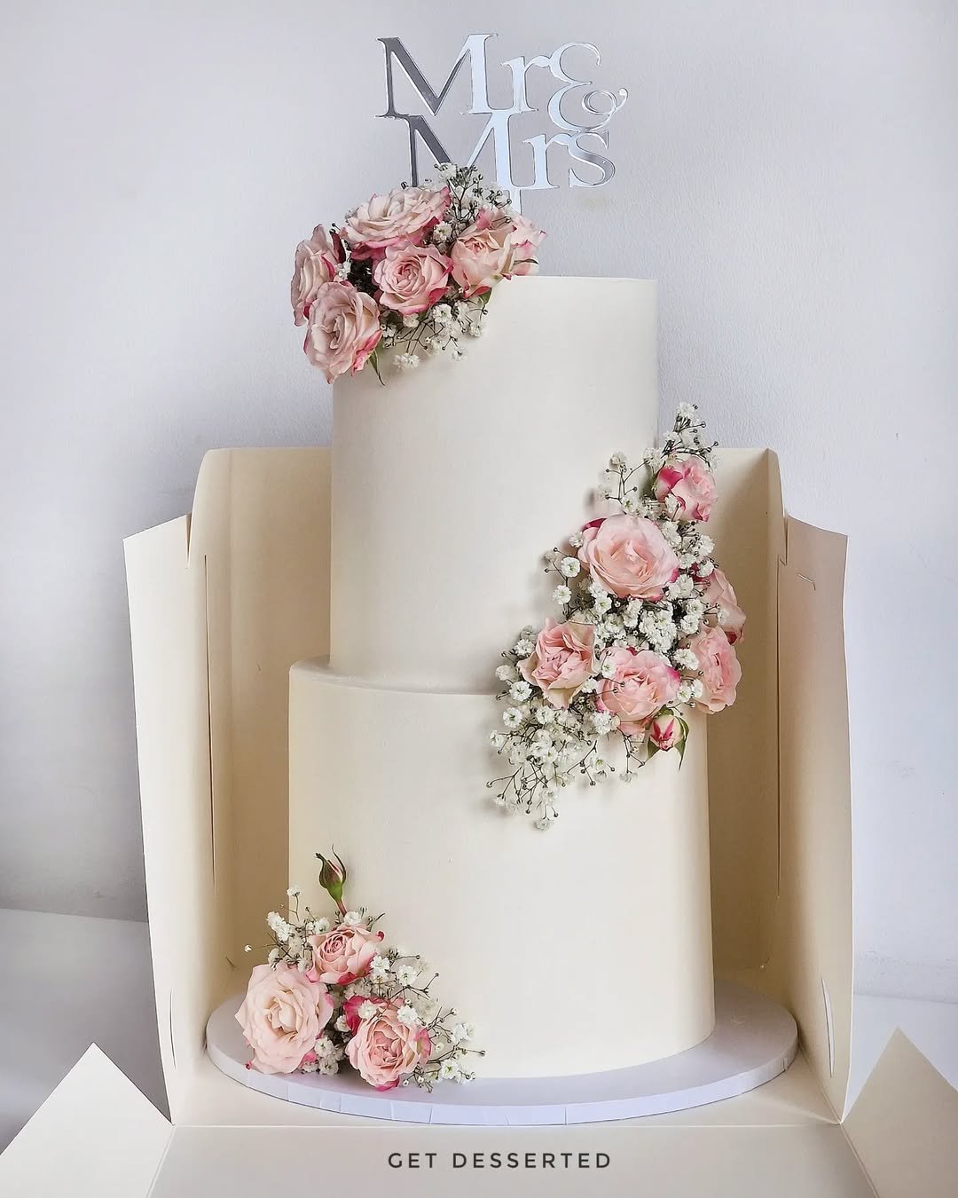 You can practically smell the rosewater from this one. Delicate white tiers host sprawling blooms in cream and blush, anchored with sweet clusters of baby’s breath. It’s light, airy, and utterly romantic.