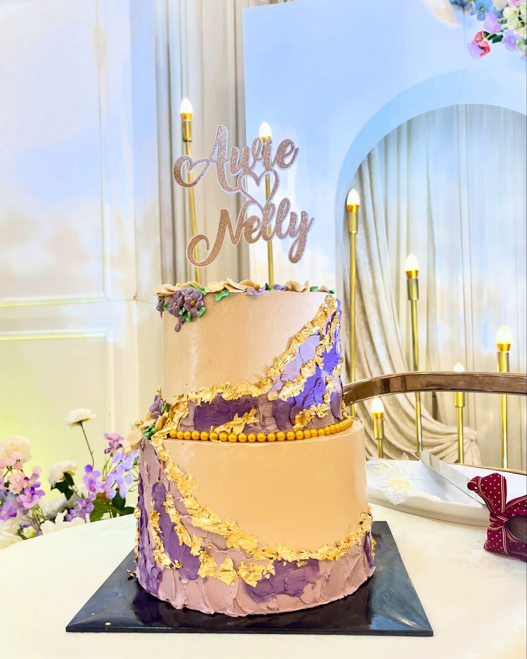 This cake has that deliciously imperfect texture that feels painterly—almost like icing was smeared by hand with love. The lavender and gold accents swirl in and out like brushstrokes, and the uneven tiers give it an artsy, fashion-forward twist.