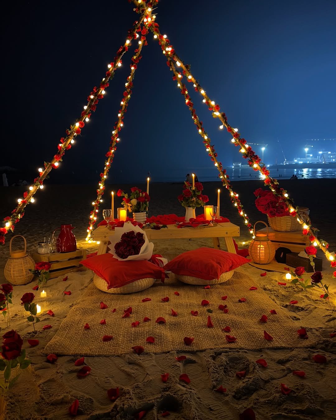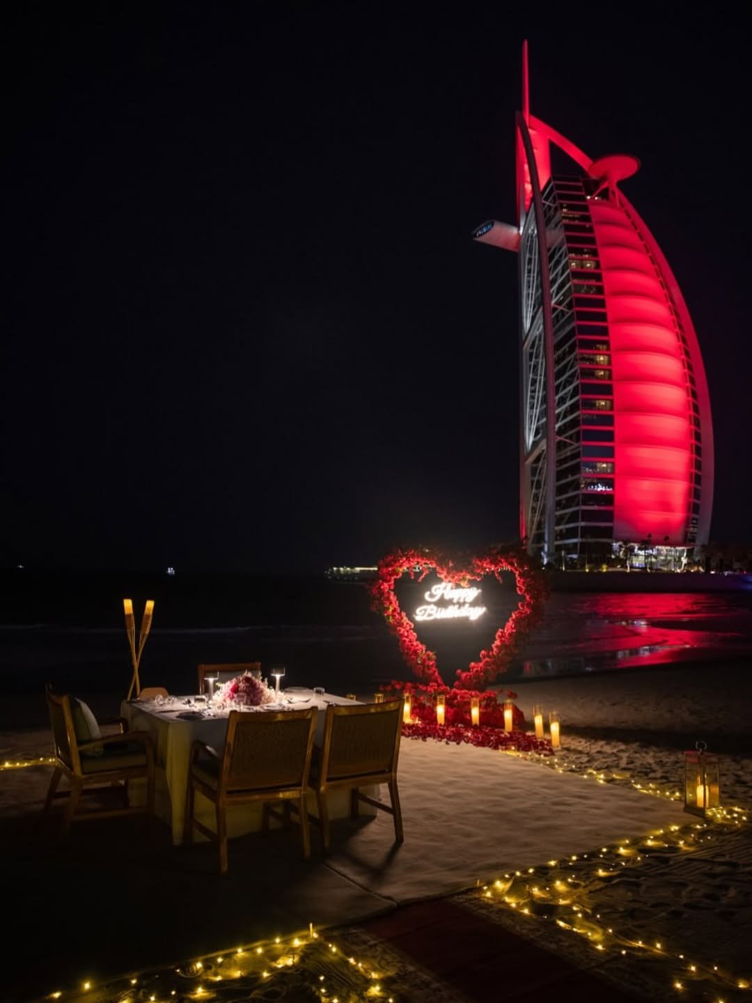 A glowing heart of roses and a perfectly lit table framed by the bold silhouette of the Burj—this beachside setup is quiet luxury with a statement twist.