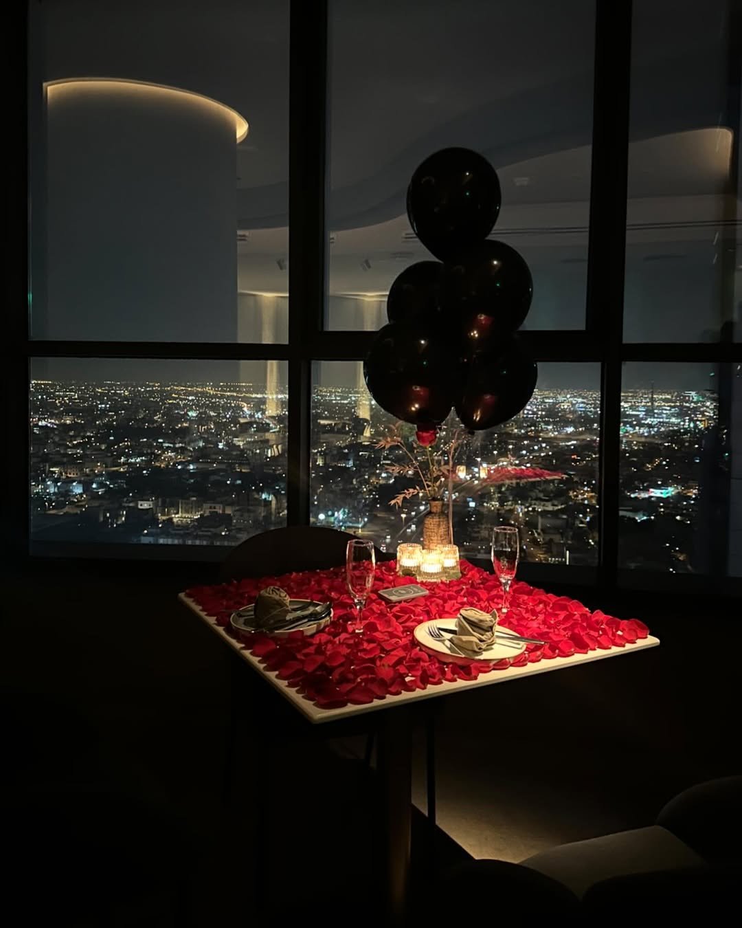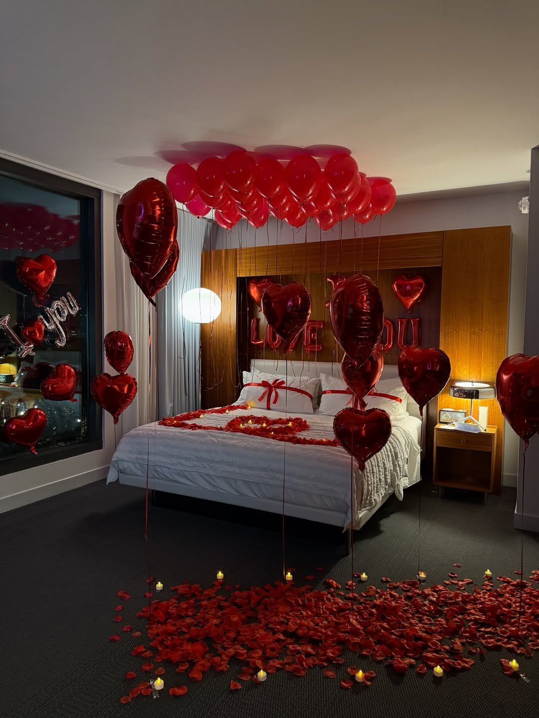Red balloons floating from floor to ceiling, candles circling the bed in a heart, and city lights shimmering through the glass—it’s dramatic, it’s fun, and it absolutely sets the scene.