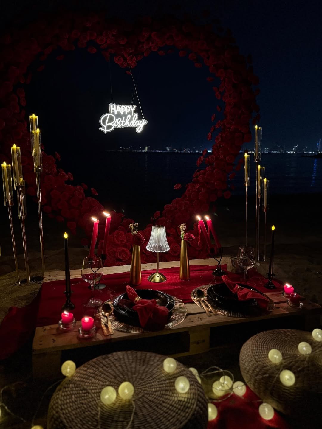Deep velvet reds, sculptural candles, and layered textures turn this table into a little jewel box by the sea. The centerpiece? A glowing “Happy Birthday” nestled into a sea of red roses.