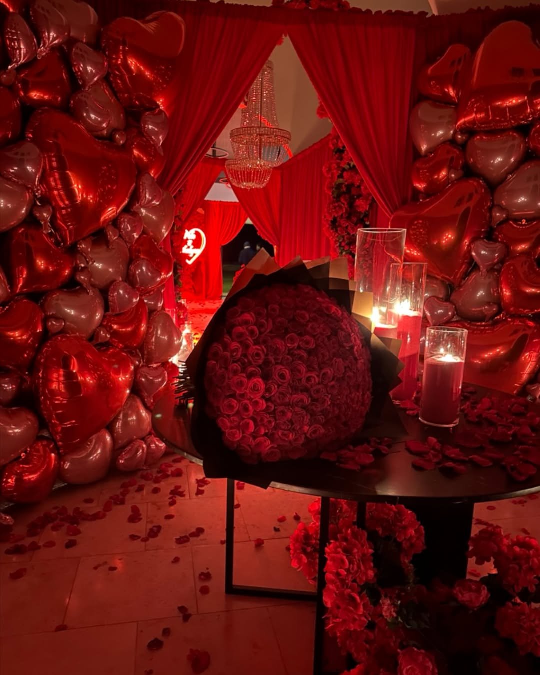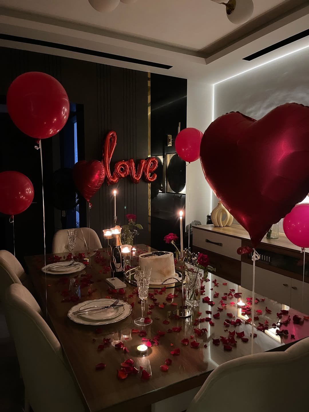 This one knows how to make “dinner at home” look like the climax of a romance film. A sleek table decked with petals, glassware that catches the light just right, and those red heart balloons that practically float with emotion. The little “love” balloon signage might seem simple—but the whole setup feels personal, private, and quietly grand.