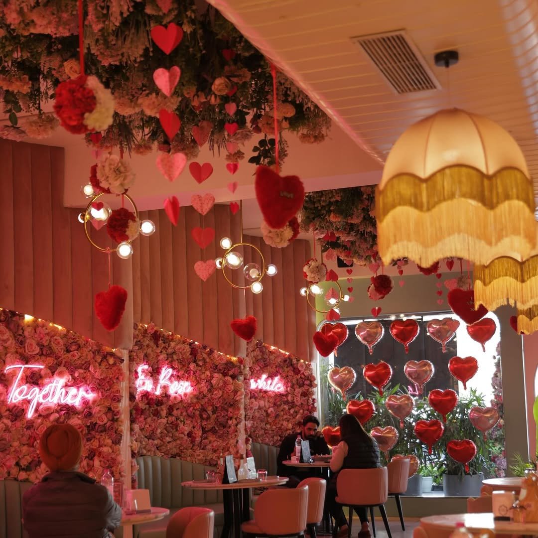 This café went full Valentine-core, and honestly? We’re here for every single puffed heart hanging from the ceiling. The florals, the pink neon signs, the love notes hidden in the walls—every corner of this space screams romance with the enthusiasm of a first crush. But it doesn’t feel cliché—it feels cinematic.