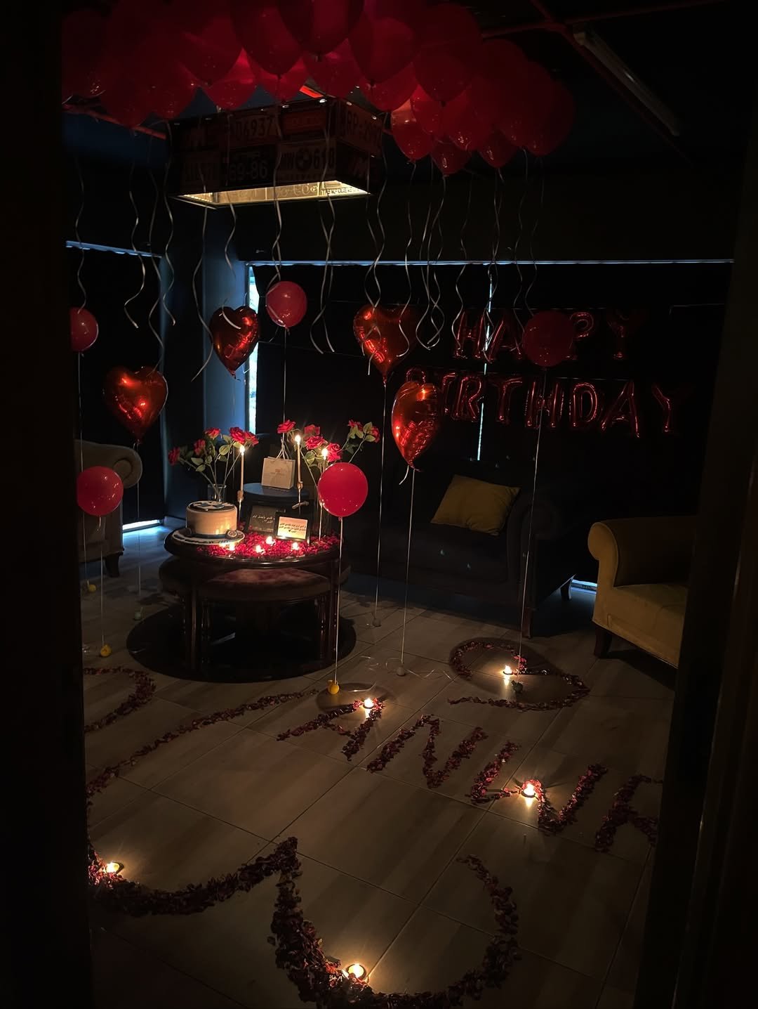 If you love details, this room nails it. Floating balloons, rose petals spelling out names, and a soft glow from every corner. It feels like love wrapped in ribbon, with a vintage-lounge twist.