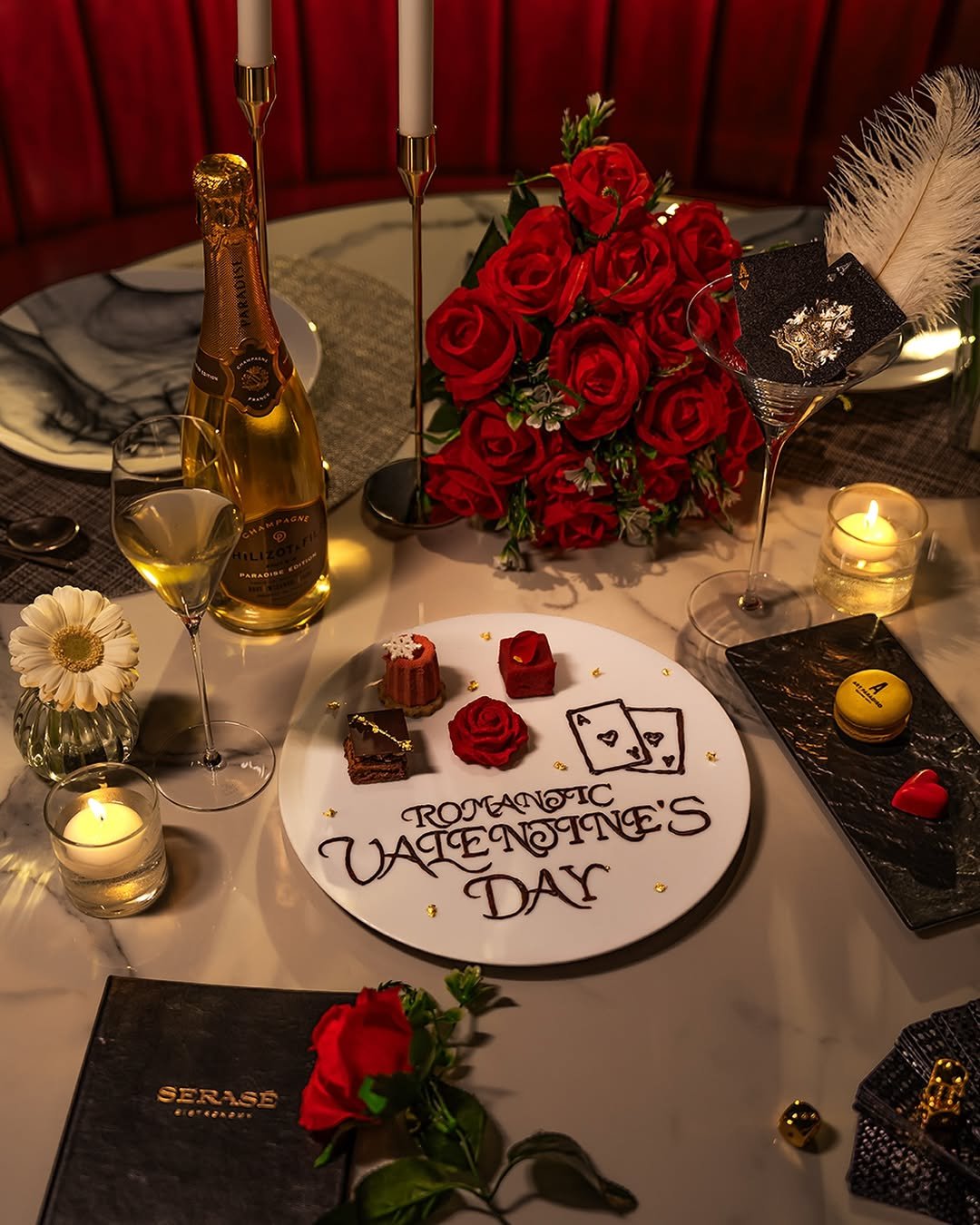 This tabletop setup is pure richness—roses, gold, and dramatic details that whisper indulgence. Even the dessert feels like part of the decor, with lettering that turns every plate into a love note.