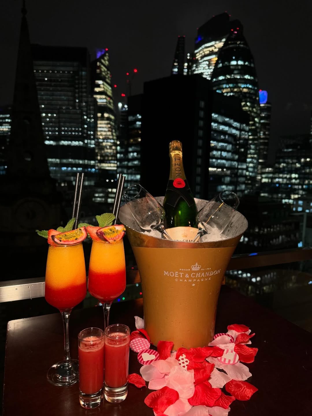 Chic, bold, and bubbly—this rooftop moment brings baby shower soirées to skyscraper level. Passionfruit cocktails (mocktail them, of course), rose petal accents, and Moët chilling nearby. The city glows below, giving it that “we’re celebrating something major” energy.