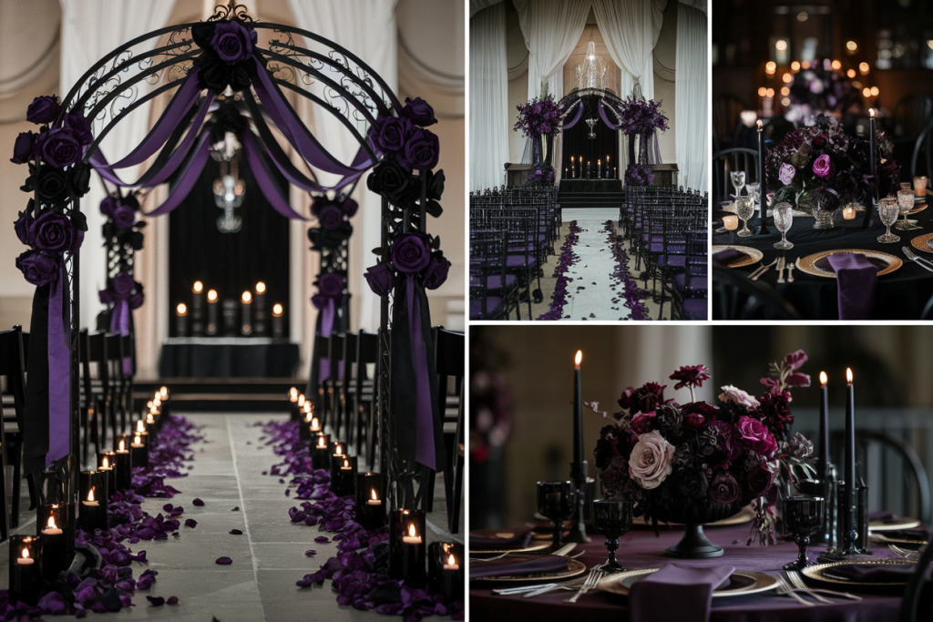 This gothic elegance wedding setup combines modern sophistication with vintage gothic elements, creating a stunning atmosphere filled with romance and mystery. Deep purples, blacks, and crystal accents enhance the mood, making it perfect for couples seeking a bold yet refined aesthetic.