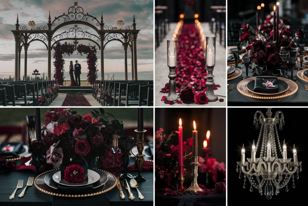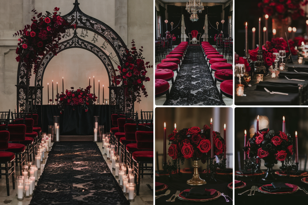 This darkly romantic and opulent Victorian Gothic wedding combines deep reds, black roses, and soft candlelight to create a striking, elegant atmosphere. Perfect for couples seeking a dramatic, timeless setting, this design captures the passion and mystery of gothic romance.