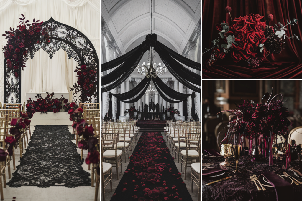This dark and dramatic vintage gothic wedding combines opulent reds, deep blacks, and rich textures, creating a mood of romantic mystery and elegance. Perfect for couples seeking a unique and passionate atmosphere, this design embraces the darker side of romance while exuding sophistication and grandeur.