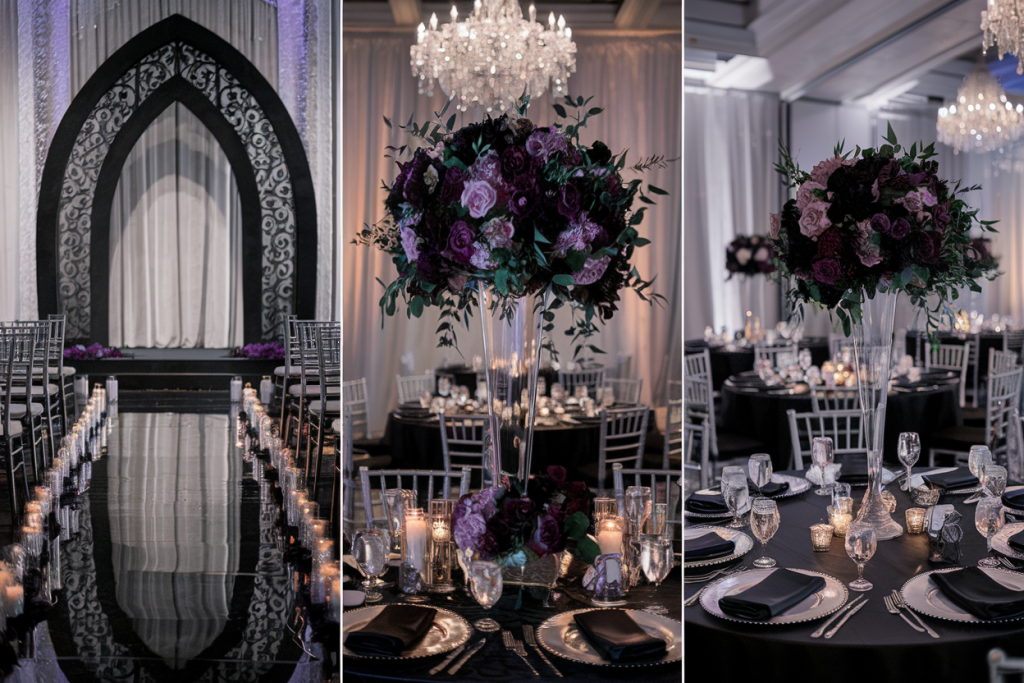 The ceremony space is marked by a grand wrought-iron arch, adorned with dark, dramatic floral arrangements in shades of purple and black. The aisle is lined with tall, elegant candles encased in glass, casting a warm glow and adding a soft contrast to the gothic backdrop. Silver chiavari chairs add a touch of glamour, complementing the sleek, dark tables set for the reception. Each table features a striking centerpiece of black and purple blooms, with crystal accents, creating a lavish and mysterious vibe. The combination of towering columns and soft candlelight gives this wedding a timeless, gothic beauty.