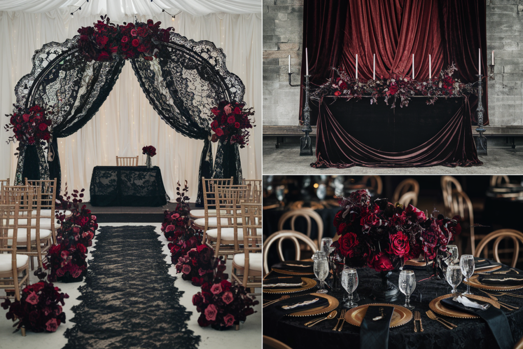 Behind the altar, a rich burgundy velvet backdrop drapes elegantly, providing a soft contrast to the gothic black lace and dark floral arrangements. The backdrop, adorned with black candles and cascading red roses, creates an opulent and intimate atmosphere. The use of velvet adds a luxurious touch, elevating the overall gothic and vintage aesthetic.
