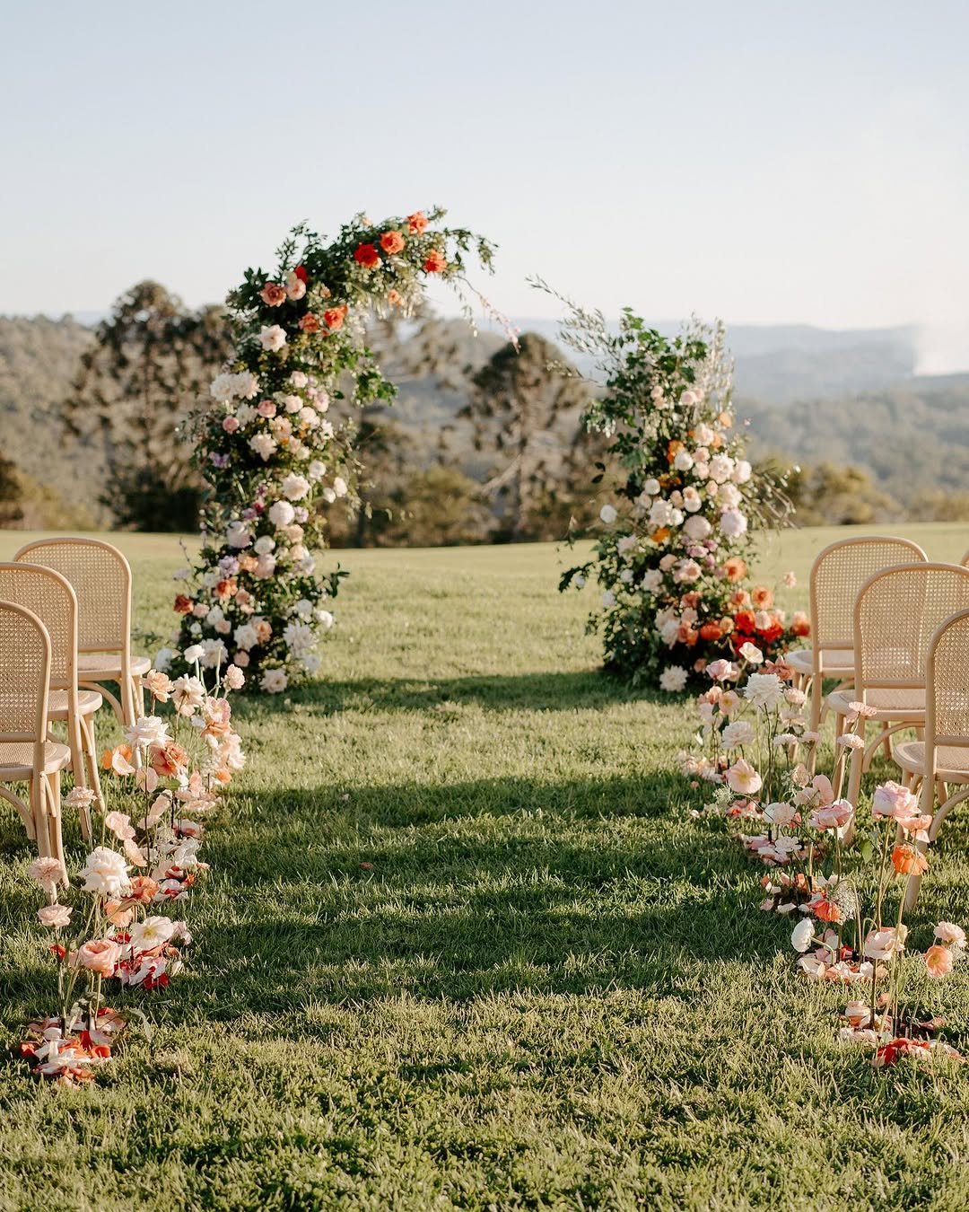 Created by the wildly talented team at @willowbudflowers, this asymmetrical arch is all tangled blooms, trailing greenery, and that just-right pop of coral and blush. I love how it leans into the wildness, like the arch is mid-embrace. The mountain view? Just icing on the (wedding) cake.