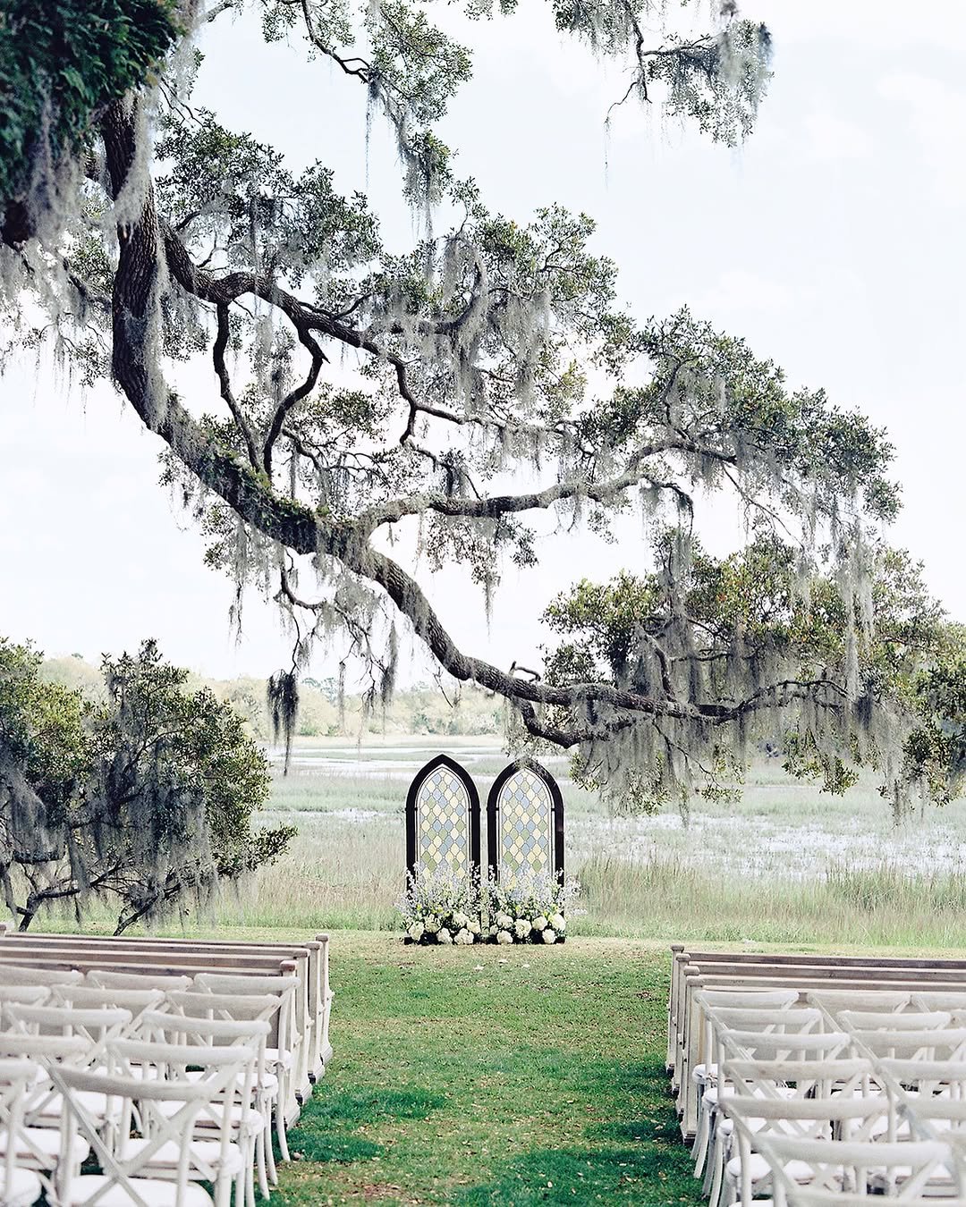 Okay—this is for the romantics who’ve dog-eared every Jane Austen novel and believe a wedding should feel like poetry on a page. Nestled beneath a canopy of draping moss and centuries-old trees, this stained glass arch by @adoni_design turns a marshy Charleston meadow into an open-air chapel.