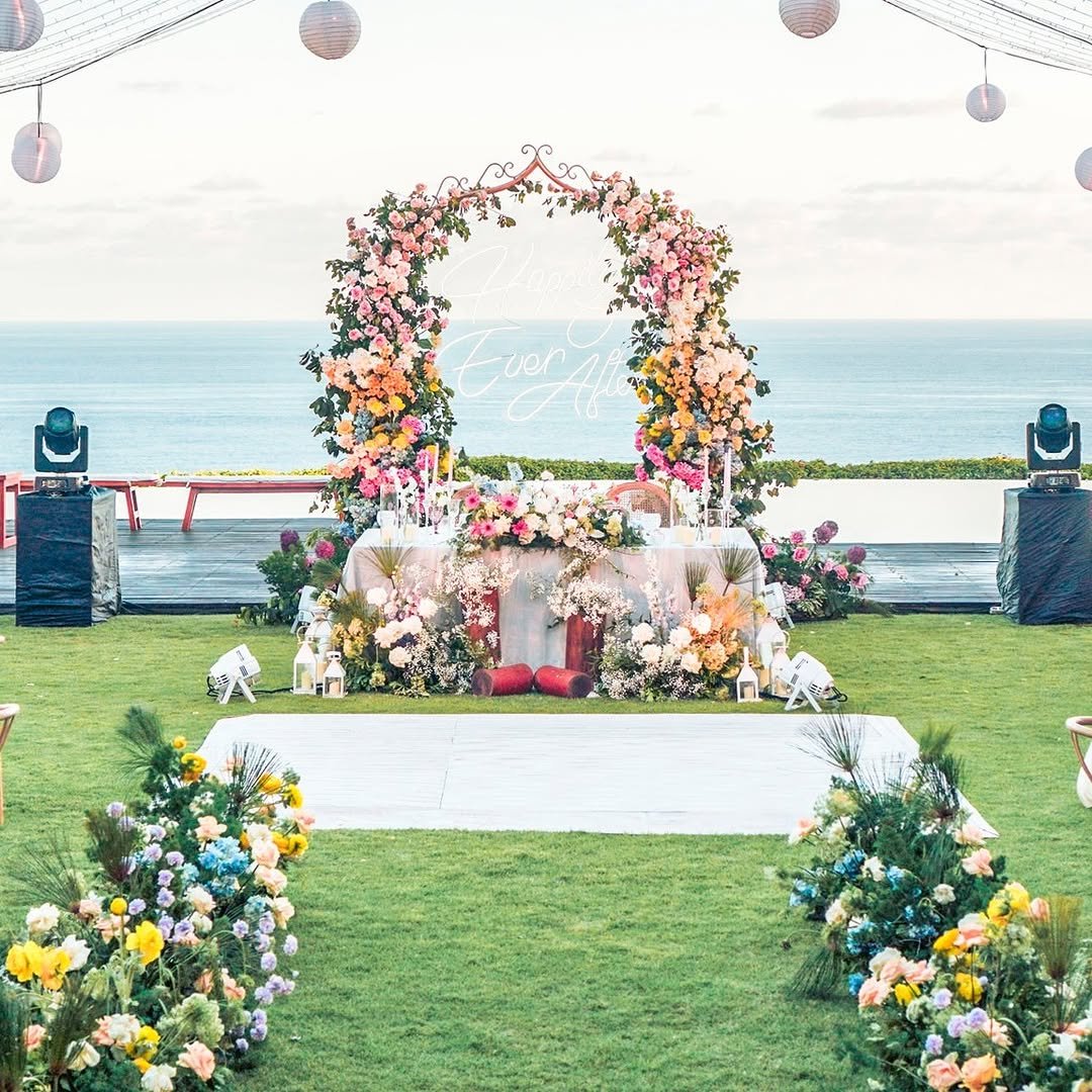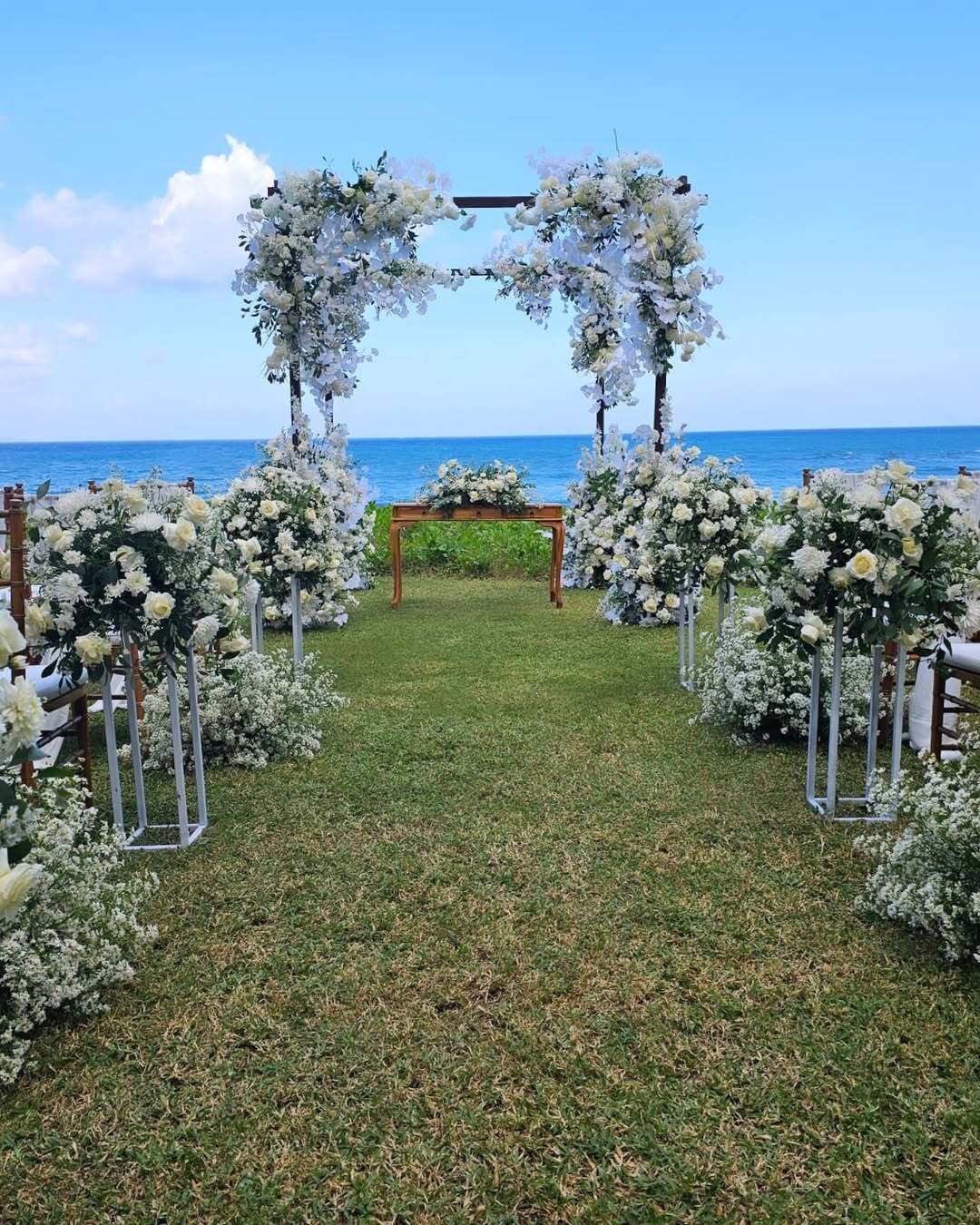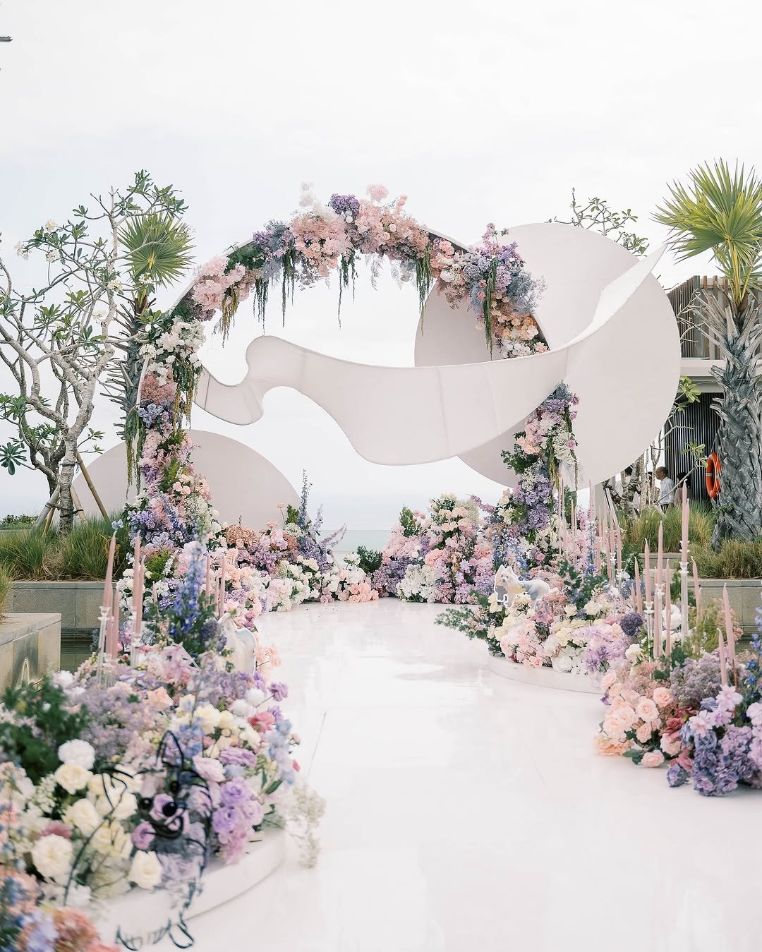 This one? It’s giving ocean breeze and aisle dreams. With that crystalline Bali sea as the backdrop and fluffy blooms piled high in every direction, this floral arch feels like it’s literally floating between sea and sky.