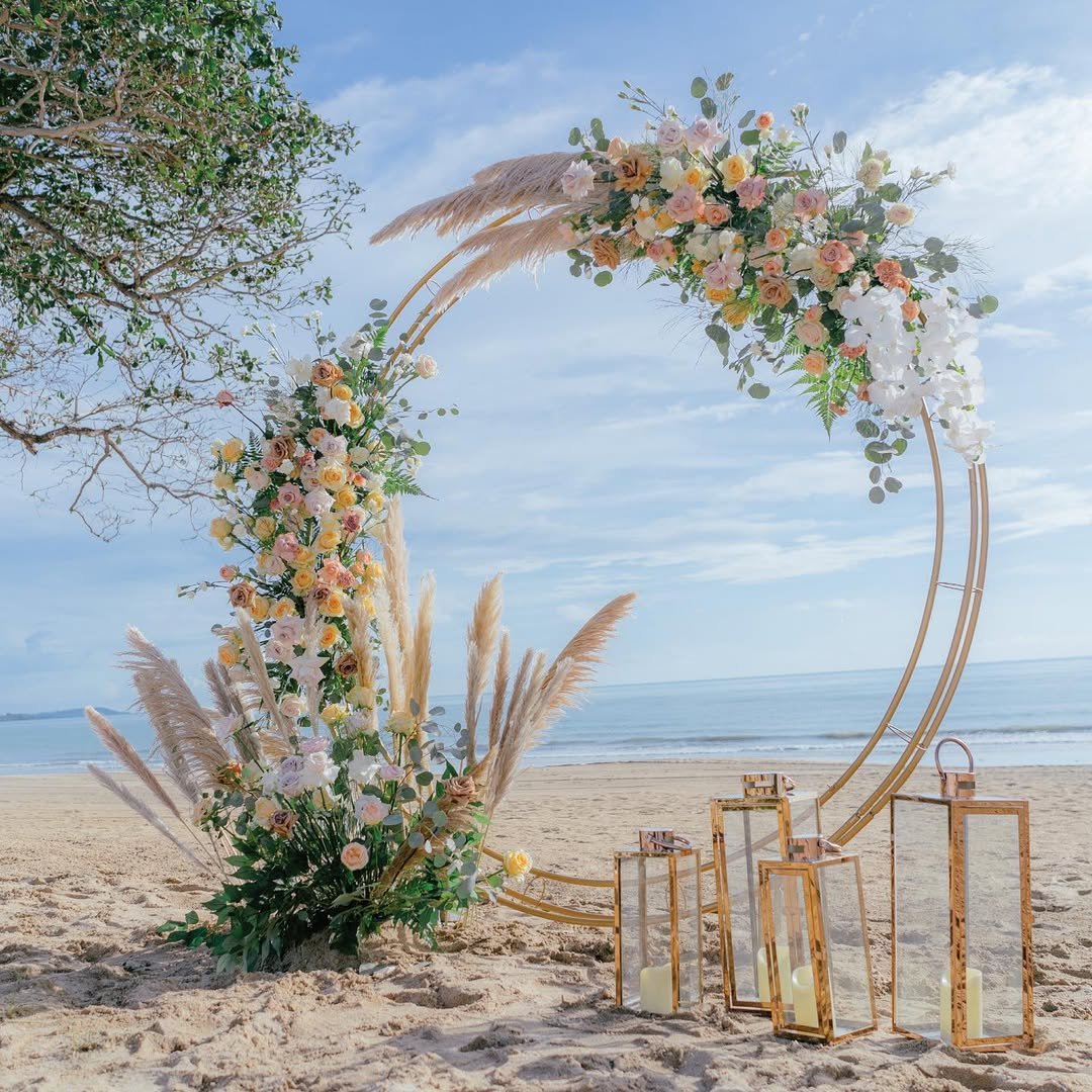 What I love most is the asymmetrical design—how one side climbs skyward with delicate blush roses and soft ivory orchids, while the other dips gracefully like a palm waving hello to the tide. The golden lanterns at the base? Obsessed. They add the kind of soft flicker that says, “We’ll dance here long after the sun goes down.”