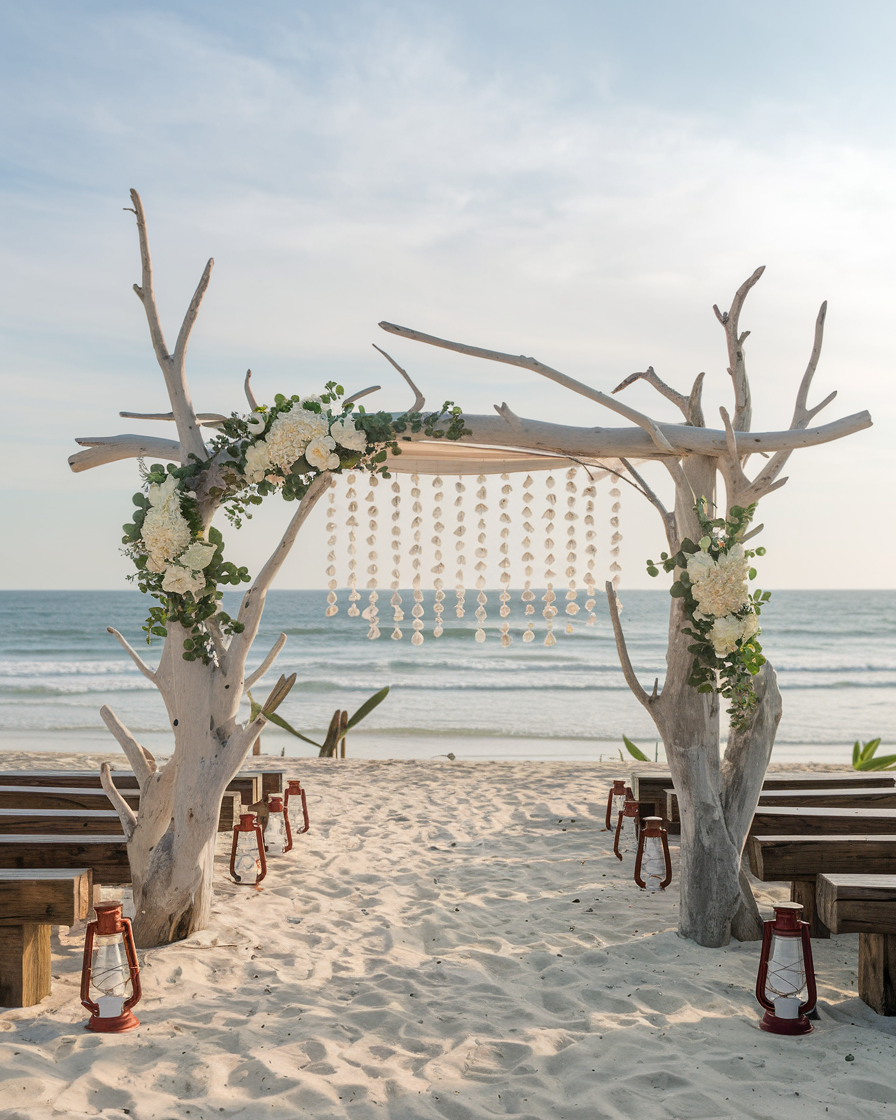 I instantly fell for this one. The weathered driftwood, the creamy blooms, those delicate shell strands swaying in the breeze… it feels like the ocean styled this arch herself.