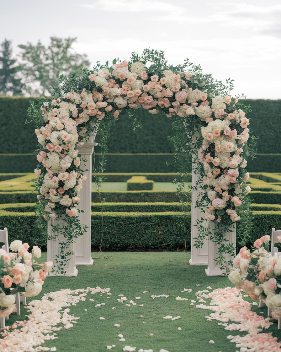 This is storybook classic in the best way. Blousy blush roses, pale hydrangeas, and soft sprays of greenery twist over white columns like a secret garden dream come to life. There’s something so timeless about it — it gives you that “Pride and Prejudice but make it Pinterest” energy (and yes, I definitely imagined Mr. Darcy walking through it).