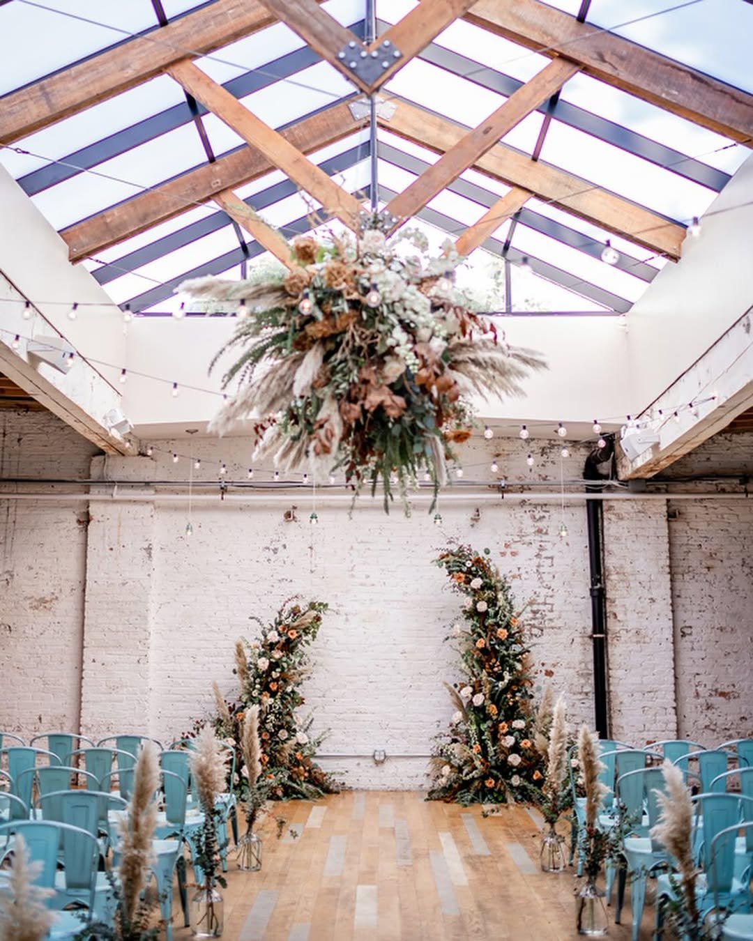 There’s something wildly poetic about love blooming in unexpected places—and this dreamy floral setup by @romeewillowflorals proves it. Set against a raw white brick wall and beneath exposed beams and skylights, this arched arrangement of twin towers feels like nature crashing a warehouse party (in the best way possible).