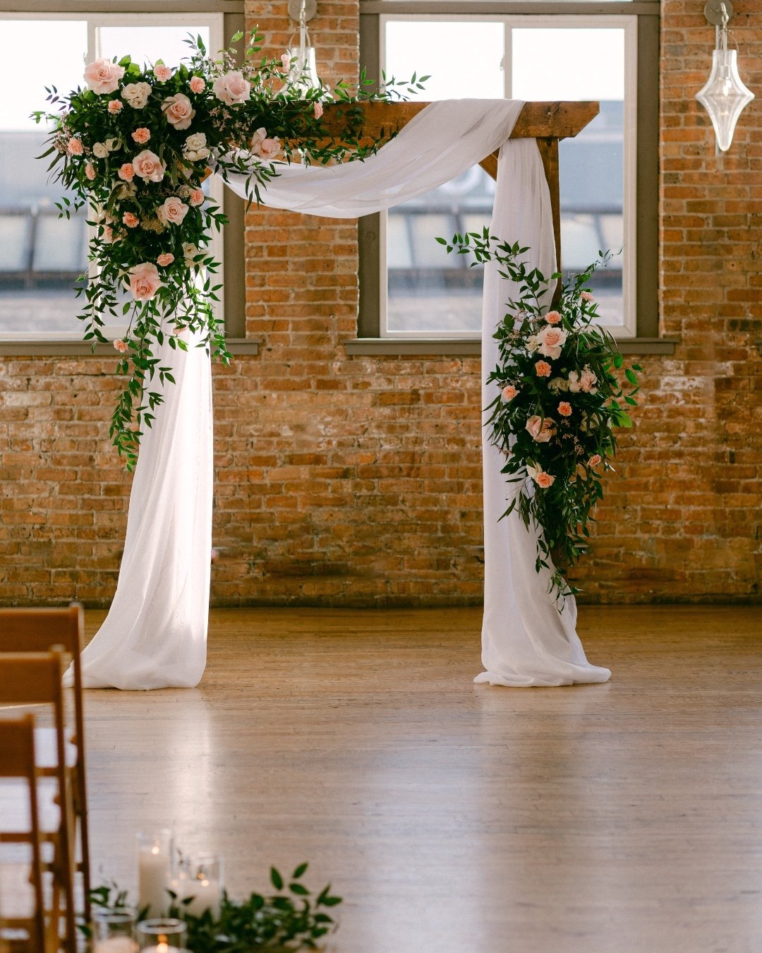 I have such a soft spot for this kind of setup — where industrial meets ethereal and they somehow get along perfectly. This dreamy draped arch from @cityviewloft in Chicago balances raw brick and soft chiffon in the most graceful way.