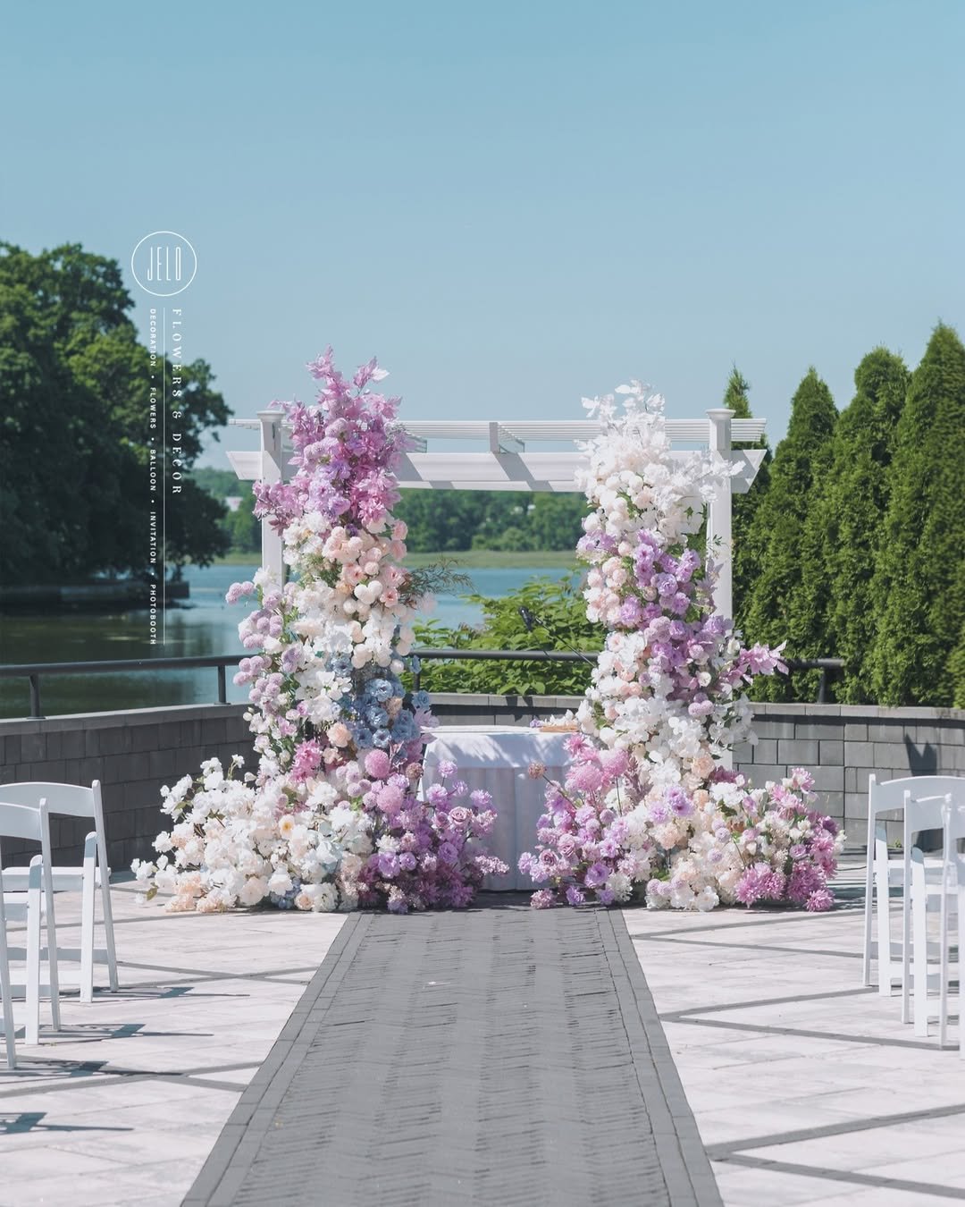 I mean… just look at those layers of lilac, blush, and snow-white blooms cascading like a romantic waterfall. There’s something so effortlessly magical about the way the florals spill onto the ground, as if love itself couldn’t be contained to the arch.