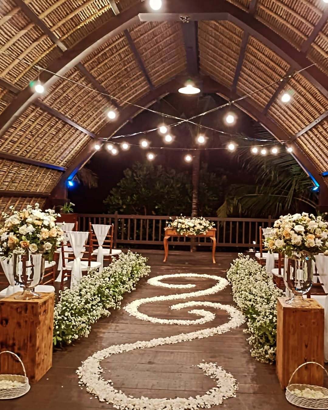 Okay, but how dreamy is this setup? Instead of a traditional arch, this design leans into the charm of its tropical structure—string lights draped from the thatched ceiling, petals swirling down the aisle like a love note in cursive. It’s romantic, a little unexpected, and totally transportive.
