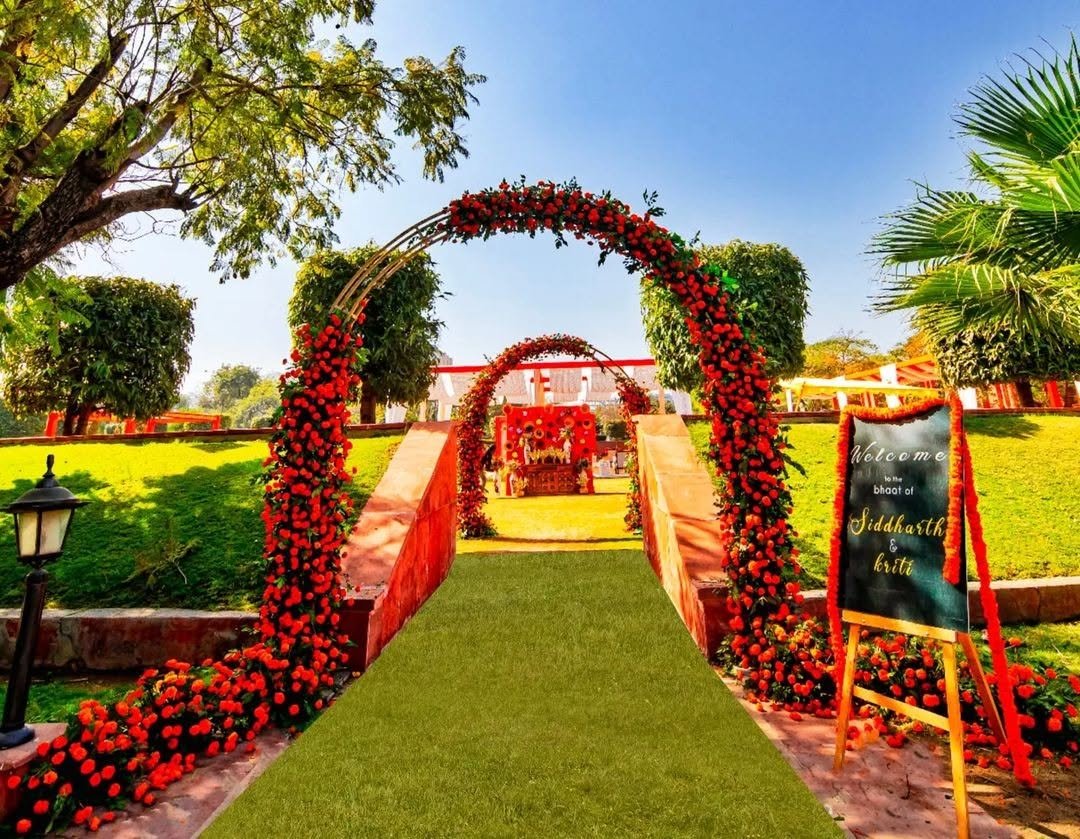 The vivid contrast against that lush green lawn? Perfection. And the welcoming sign wrapped in florals? Consider me officially obsessed. If there were ever a place to make a grand entrance worthy of Bollywood dreams, this is it.