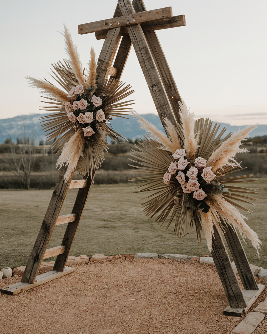 Okay, how cool is this? The raw wood A-frame, the fan palms and blush roses — it’s giving boho romance with a little edge.