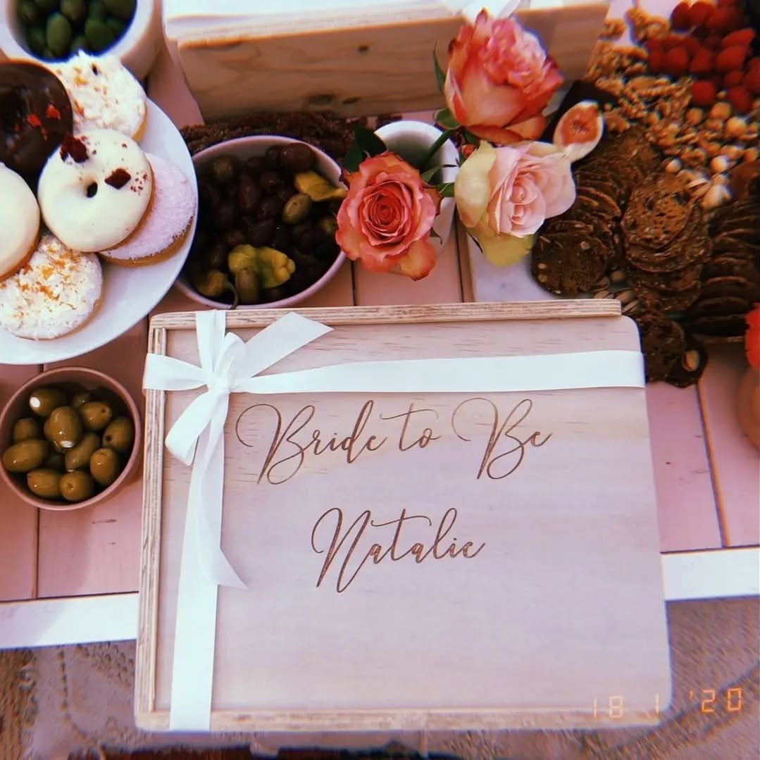 This custom box from @thebridalboxco feels like a love letter just for her. The delicate script, tied ribbon, and dreamy grazing table in the background make it clear — this isn’t just a gift, it’s a whole moment of celebration.