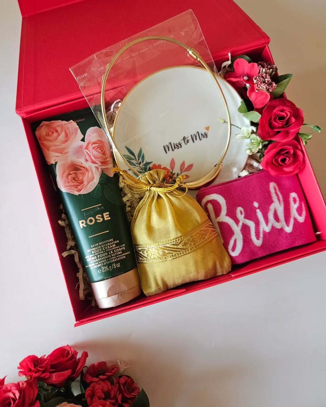 This vibrant gift box from @sassy_square feels like pure wedding week excitement bottled up in the prettiest way. Between the “Miss to Mrs.” keepsake plate, luxe rose-scented lotion, and that joyful pop of fuchsia with the “Bride” towel, it’s basically a party in a box.
