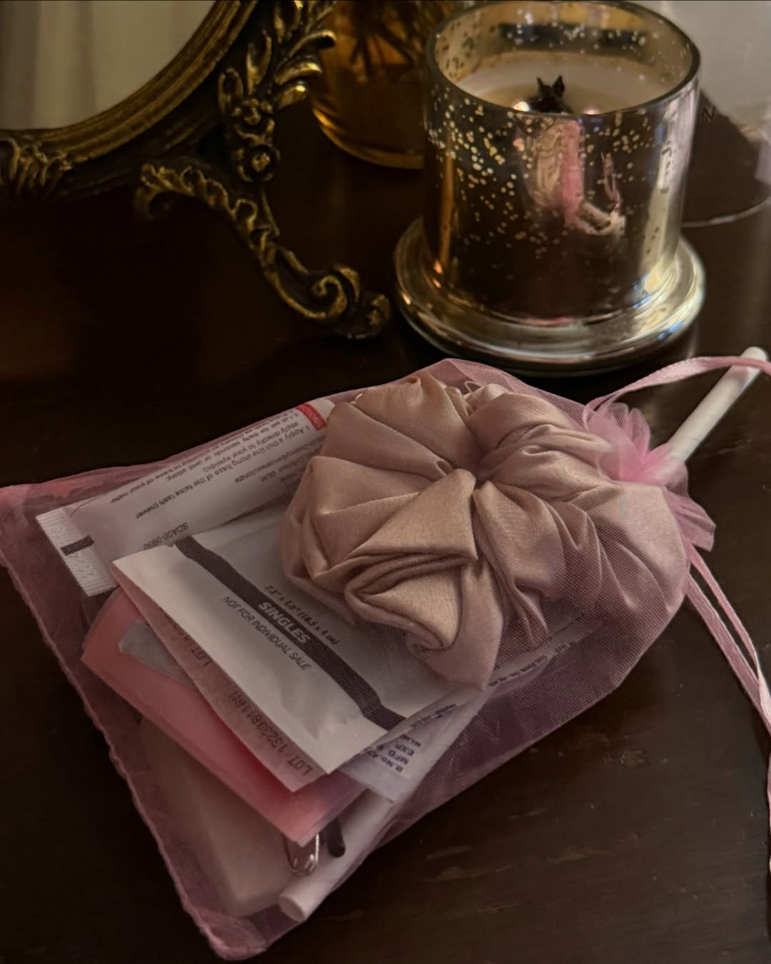 This sweet little pouch by @samreensandhuu is pure genius — a soft, pink survival kit for the big day. Packed with all the tiny essentials (think scrunchies, bobby pins, and touch-up must-haves), it’s like a quiet promise that everything’s going to be perfect.