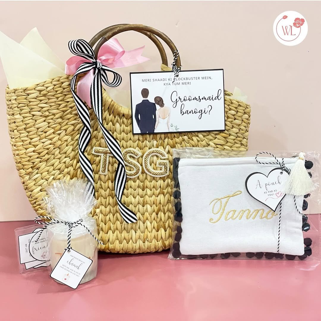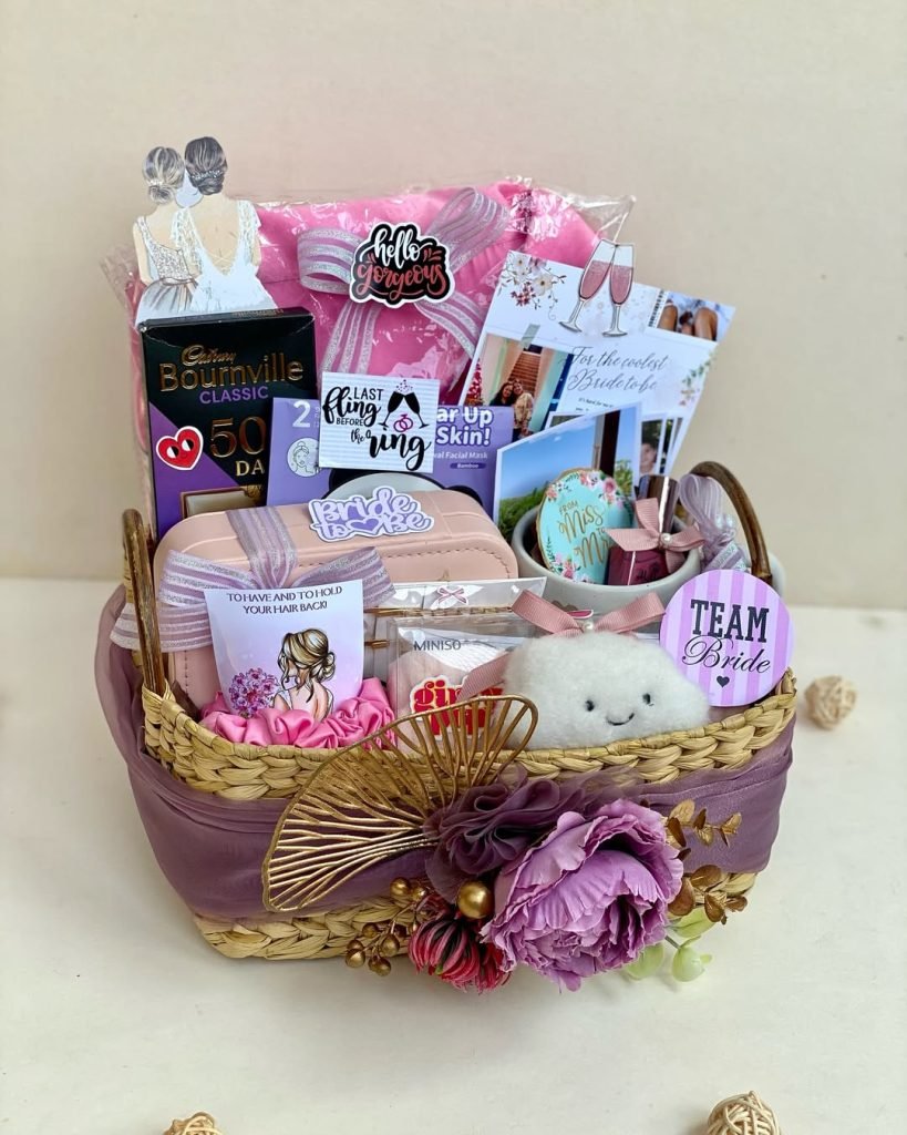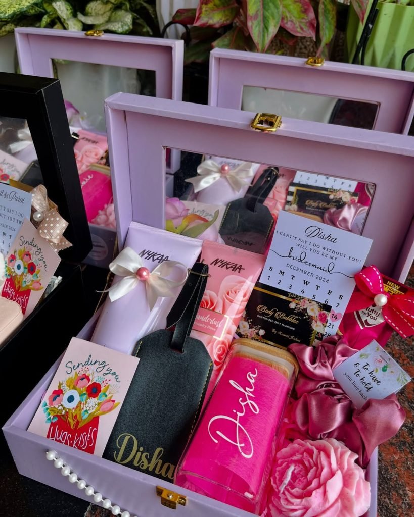 Delicate lilac boxes, blooming with rose-scented pampering, personalized touches, and satin-soft keepsakes. From the glossy pink tumbler to the miniature calendar marking the day, every inch is a love letter to the friendships that make the big day even bigger.