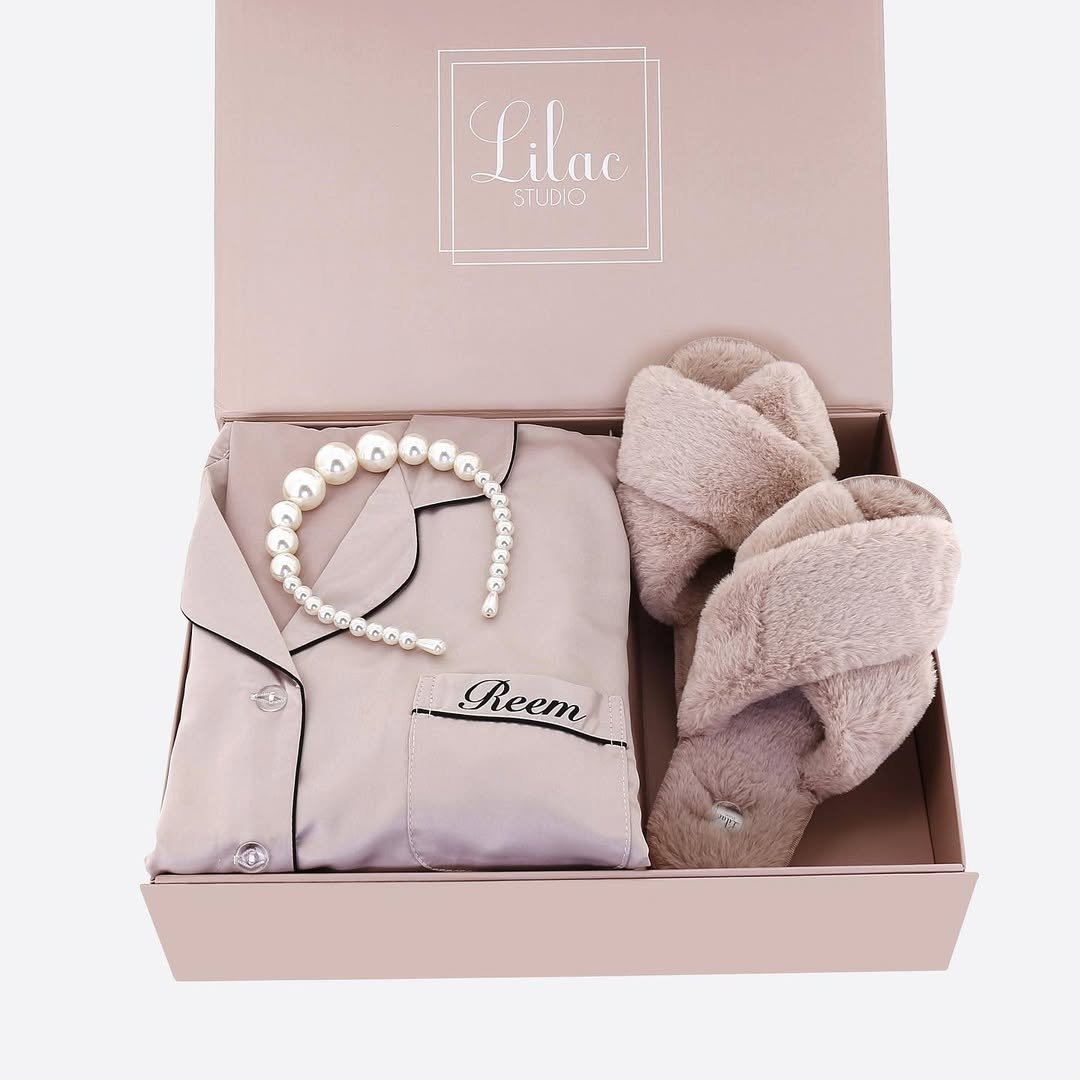 This luxe set from @lilacstudio.ae is bridal pampering at its absolute finest. ✨🕊️ With silky personalized pajamas, plush crisscross slippers, and a glam pearl headband, it’s basically everything she needs for a slow, champagne-sipping morning before the “I do.”